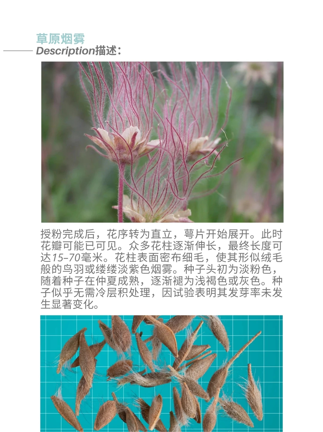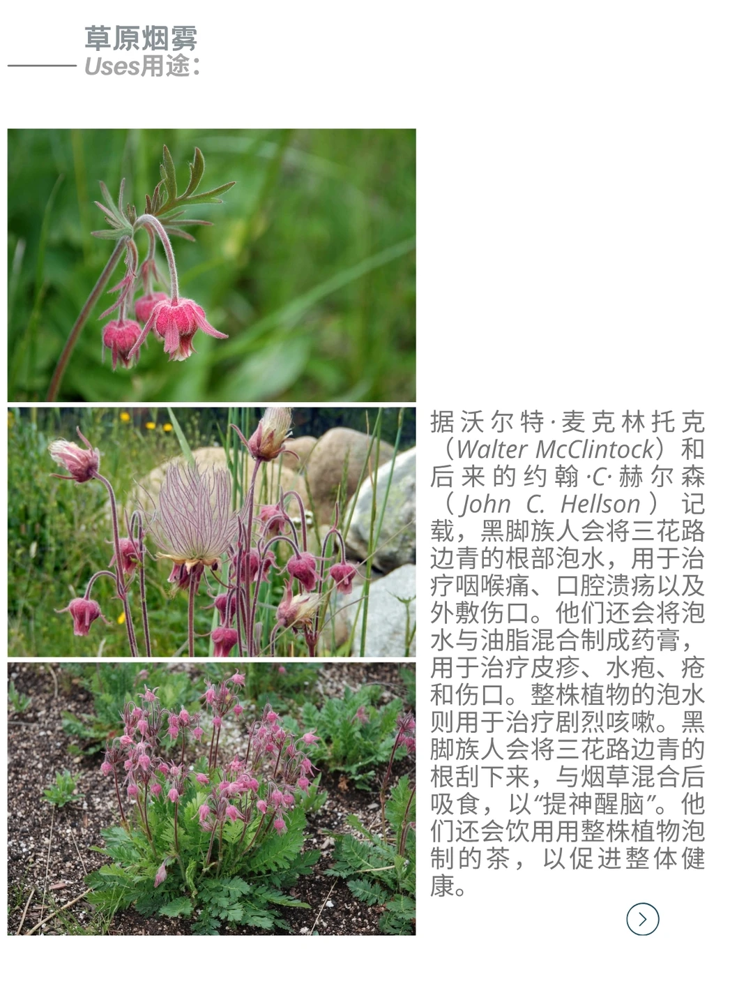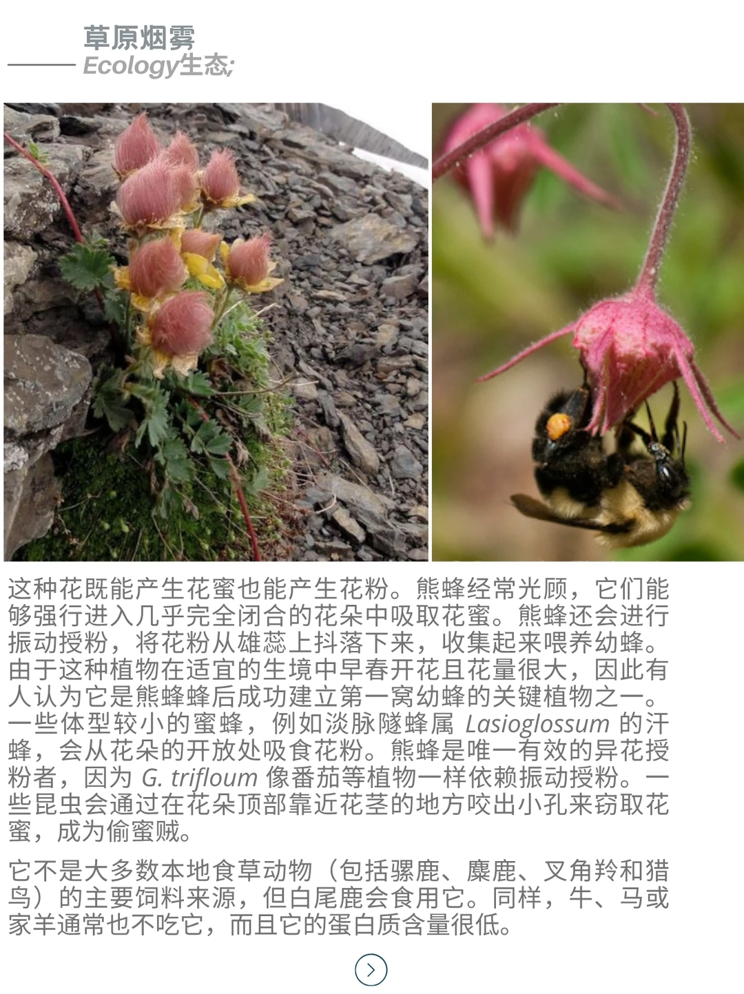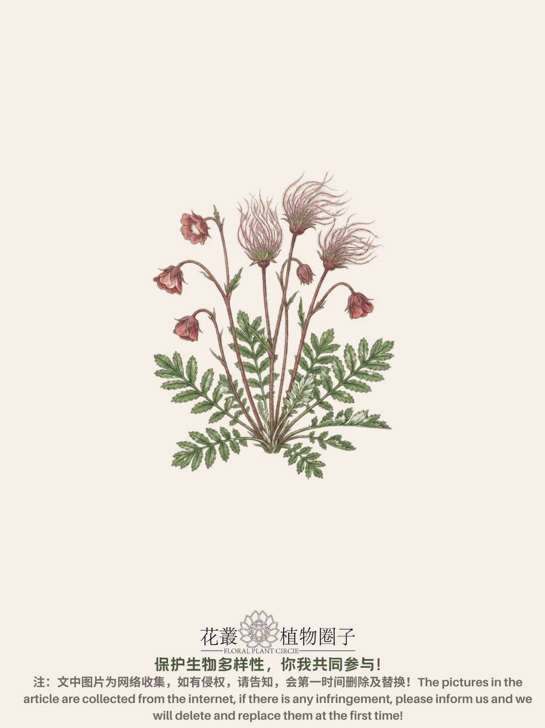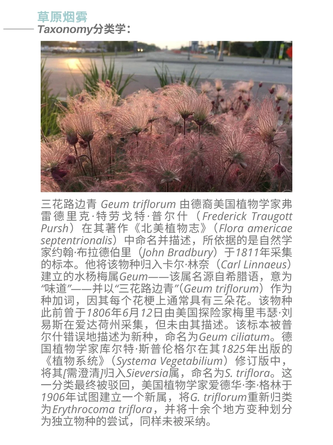 三花路边青 Geum triflorum ,俗称草原烟、老翁胡须或三花蓍,是一种春季开花的蔷薇科多年生草本植物。它属于半寒带大陆性气候物种,广泛分布于北美西部的寒冷干燥环境中,尽管在东至纽约和安大略省的地区也有零星分布。该植物尤以种子头上的长羽状穗状花序著称,这些特征不仅启发了许多地区俗名的由来,还助其种子通过风力传播。