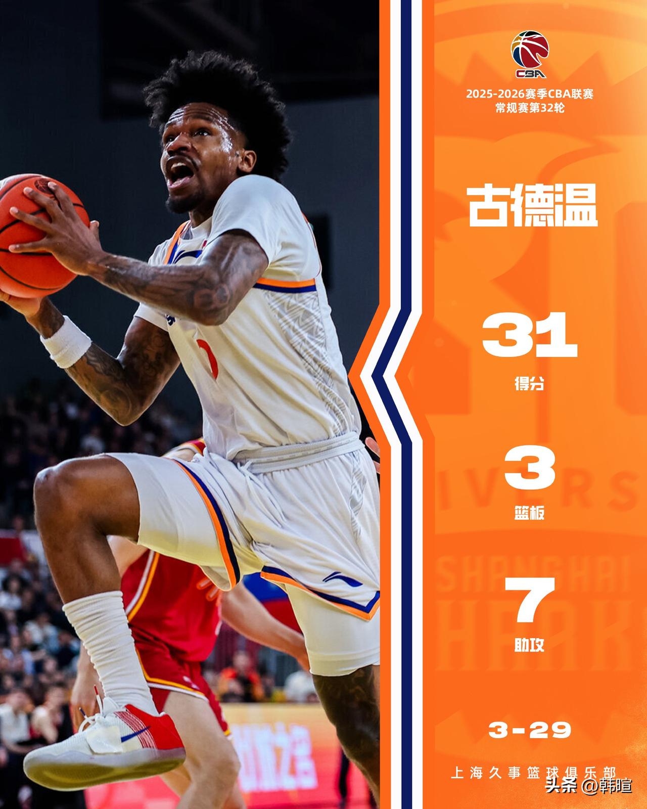 上海男篮客场100-96逆转山西男篮豪取13连胜的比赛中,上赛季效力山西男篮的古德温,无疑是上海男篮最终获胜的功臣之一! 在27分钟的出场时间之内,古德温18投10中(三分球8投4中)、10罚7中,不仅砍下全队最高的31分,也同样刷新个人赛季新高。尤其值得一说的是,在上海男篮开局20-15领先时,古德温个人已经拿到比山西男篮全队更高的16分——关键的第四节,古德温也有8分进账。 上赛季效力山西男篮期间,古德温场均贡献全队最高的25.7分。而本赛季加盟上海男篮以来,古德温场均仅14.9分,但是,面对旧主能够在不利的局面下带领上海男篮反败为胜,难怪上海男篮赛后将本场最佳(模子)颁发给了这位面对旧主毫不留情的前山西球员。 本场比赛,上海男篮还有3人得分上双,怀特塞德17分12板,李弘权16分,张镇麟15分;山西男篮的盖伊拿下30分,张宁10分、正负值为全队最低的-14。