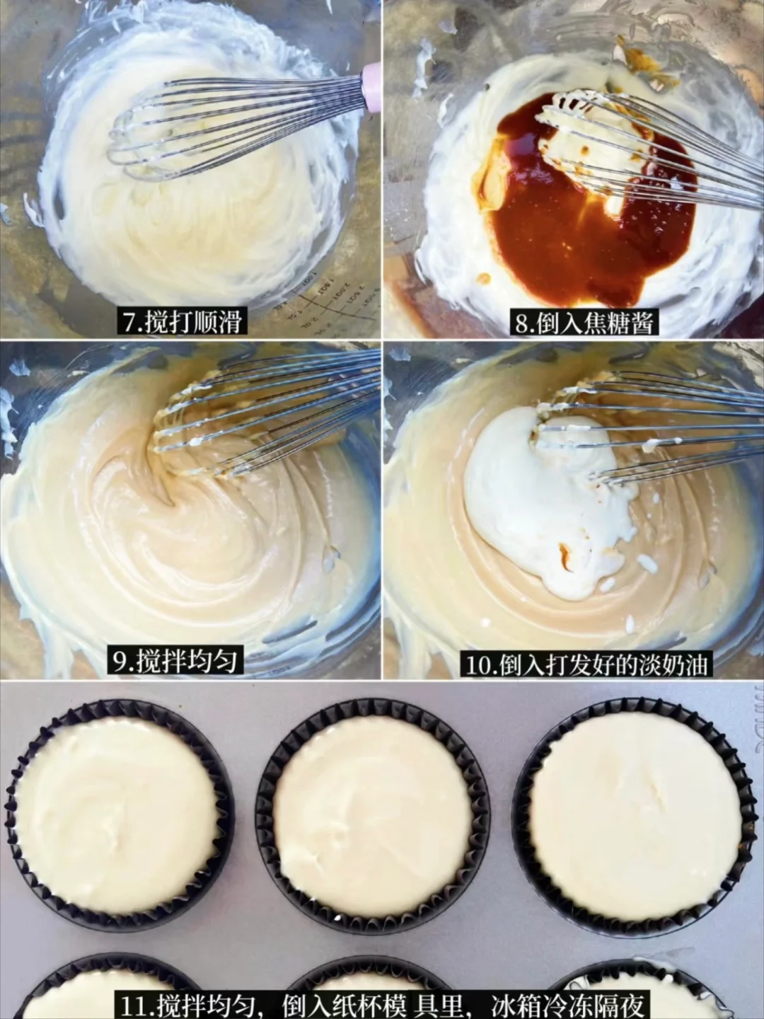 5️⃣装入裱花袋,挤入纸杯托里,倒入模具里。冰箱冷冻过夜