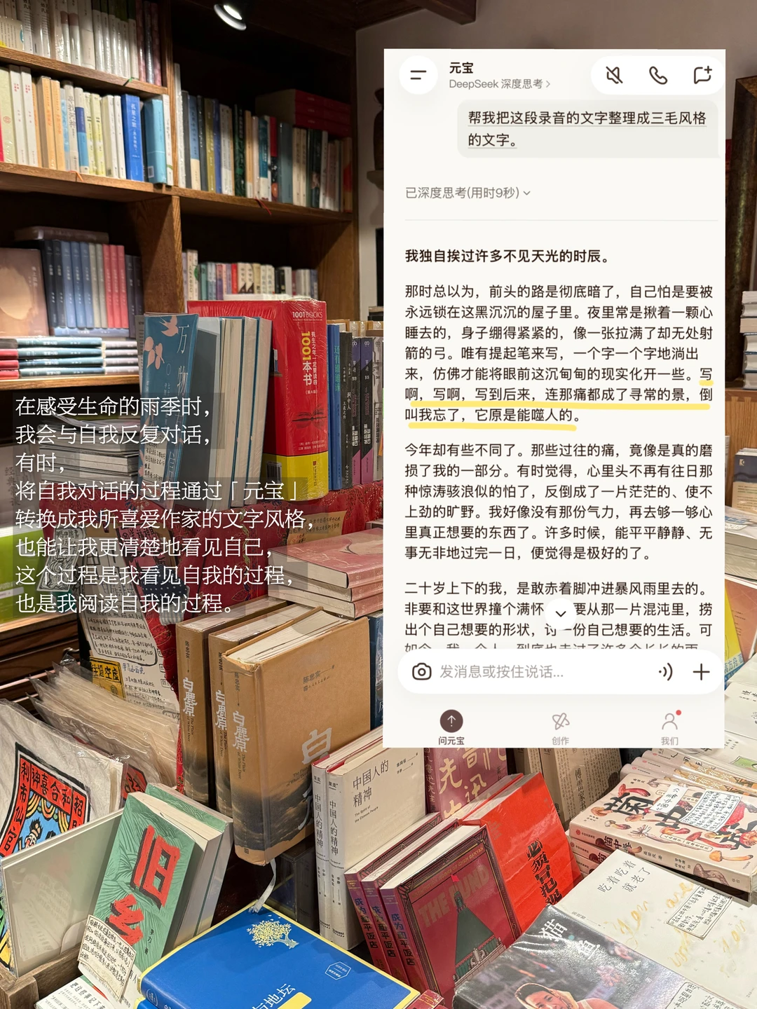 在感受生命的雨季时,我会与自我反复对话,有时,将自我对话的过程通过「元宝的AI录音笔」转换成我所喜爱作家的文字风格,也能让我更清楚地看见自己,这个过程是我看见自我的过程,也是我阅读自我的过程。