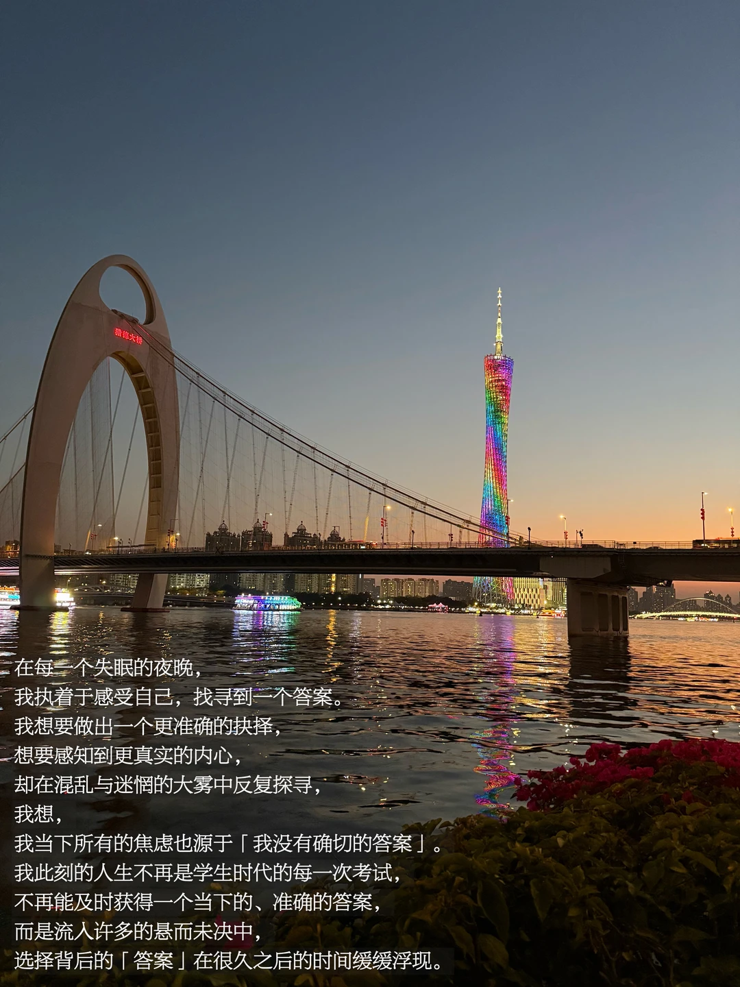 在每一个失眠的夜晚,我执着于感受自己,找寻到一个答案。我想要做出一个更准确的抉择,想要感知到更真实的内心,我想,我当下所有的焦虑也源于「我没有确切的答案」,而选择背后的「答案」在很久之后的时间缓缓浮现。