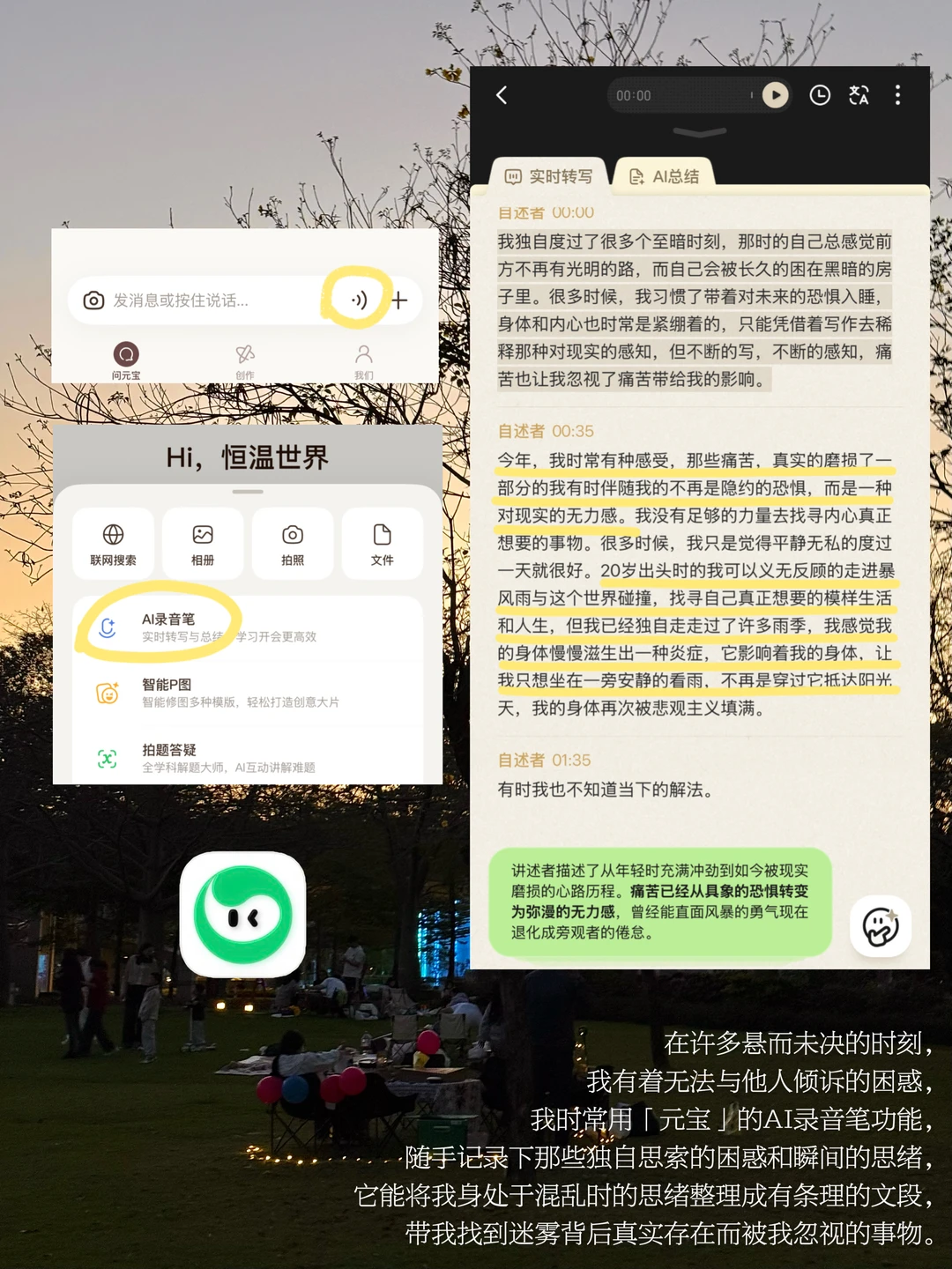 在许多悬而未决的时刻,我有着无法与他人倾诉的困惑,我时常用「元宝」的AI录音笔功能,随手记录下那些独自思索的困惑和瞬间的思绪,它能将我身处于混乱时的思绪整理成有条理的文段,带我找到迷雾背后真实存在而被我忽视的事物。