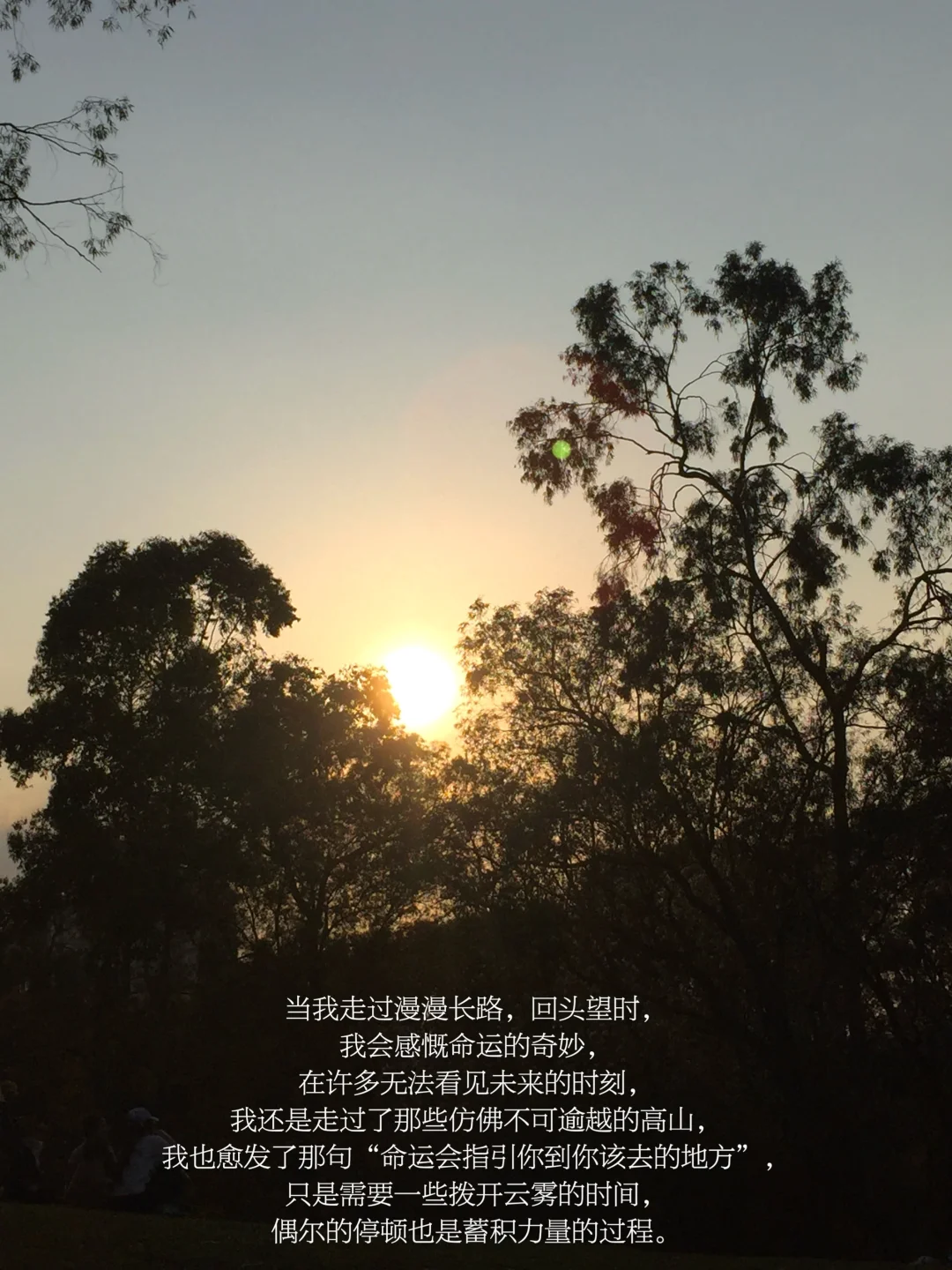 当我走过漫漫长路,回头望时,我会感慨命运的奇妙,在许多无法看见未来的时刻,我还是走过了那些仿佛不可逾越的高山,我也愈发了那句“命运会指引你到你该去的地方”,只是需要一些拨开云雾的时间,偶尔的停顿也是蓄积力量的过程。