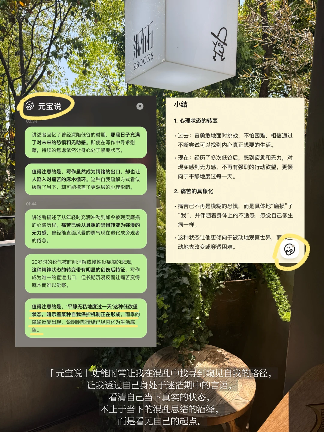 「元宝说」功能时常让我在混乱中找寻到窥见自我的路径,让我透过自己身处于迷茫期中的言语,看清自己当下真实的状态,不止于当下的混乱思绪的沼泽,而是看见自己的起点。