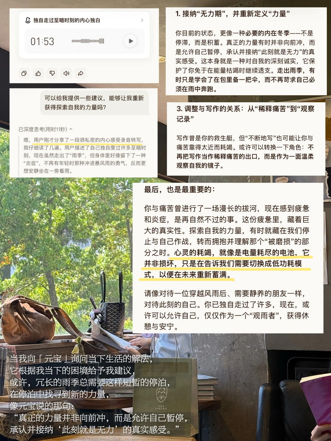 当我向「元宝」询问当下生活的解法,它也能根据我当下的困境给予我建议,或许,冗长的雨季总需要这样短暂的停泊,在停泊中找寻到新的力量,像元宝说的那句:“真正的力量并非向前冲,而是允许自己暂停,承认并接纳‘此刻就是无力’的真实感受。”