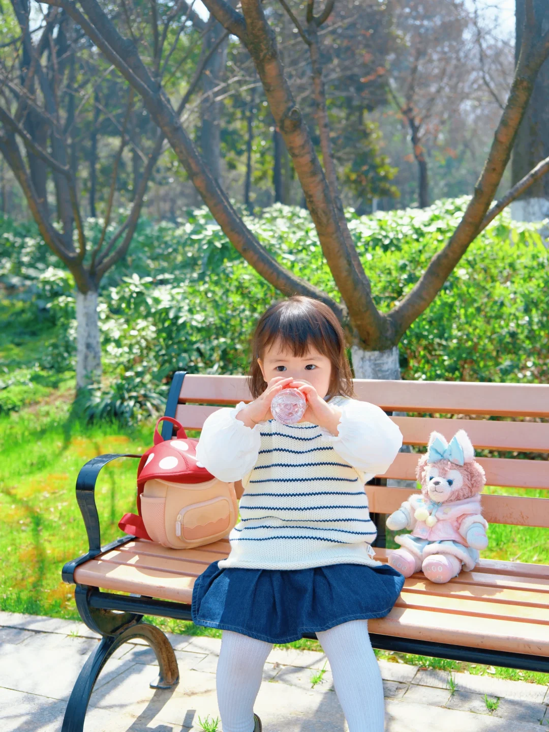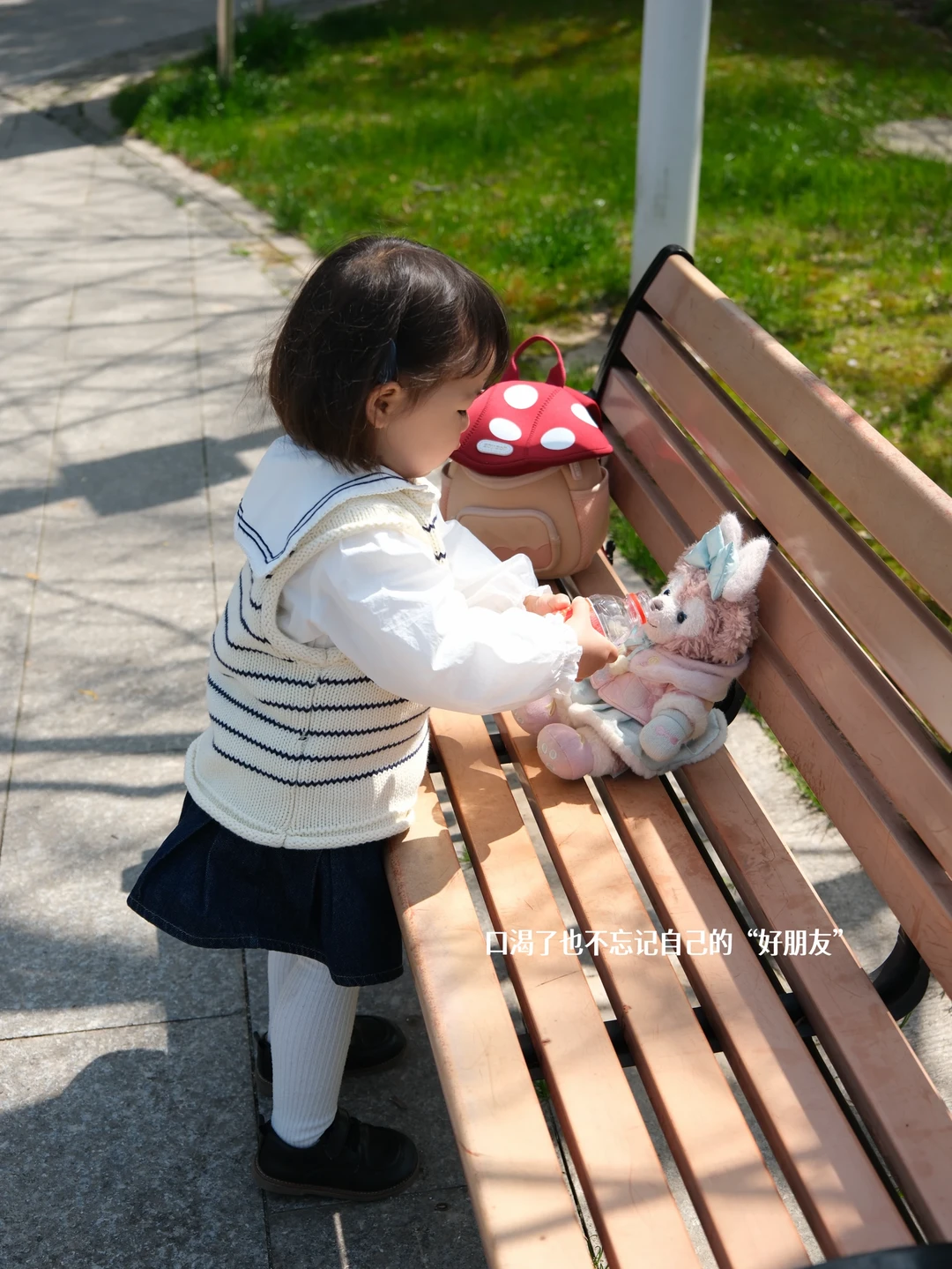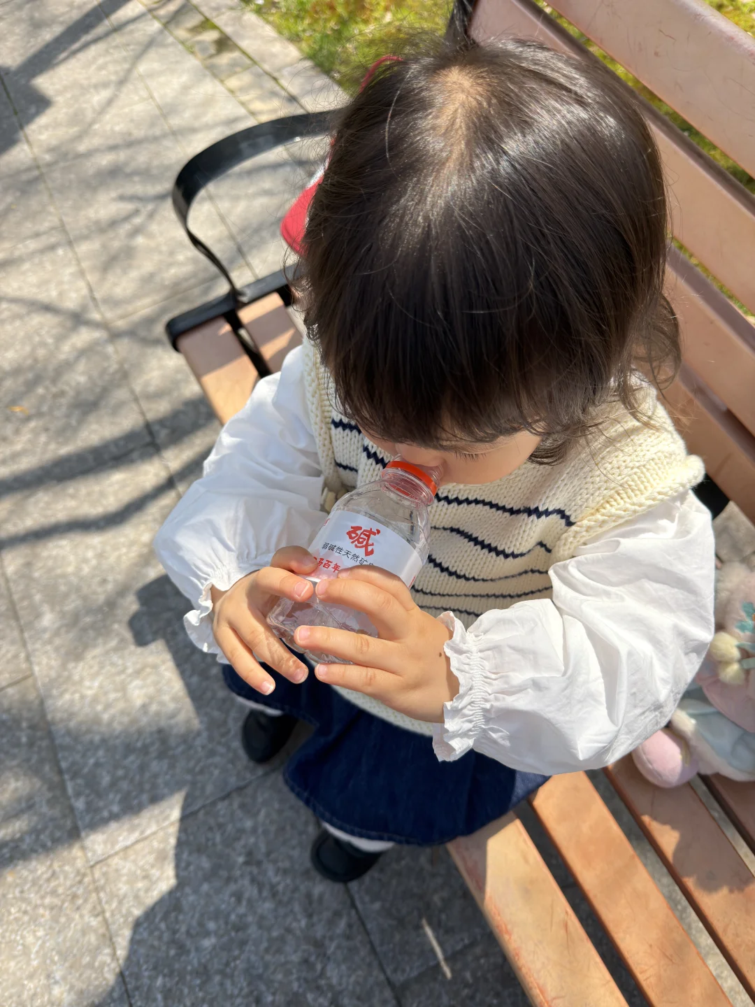 小家伙坐在公园长椅上,自己捧着小水瓶