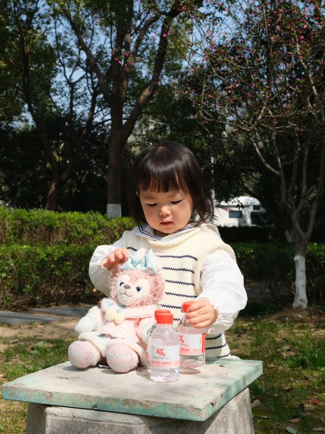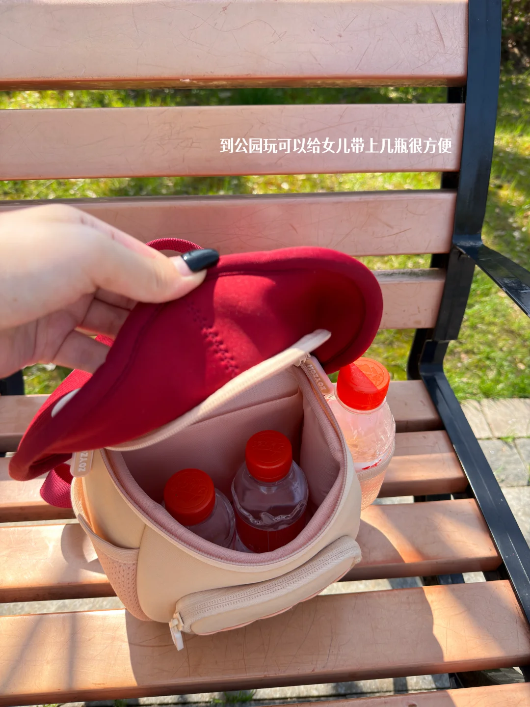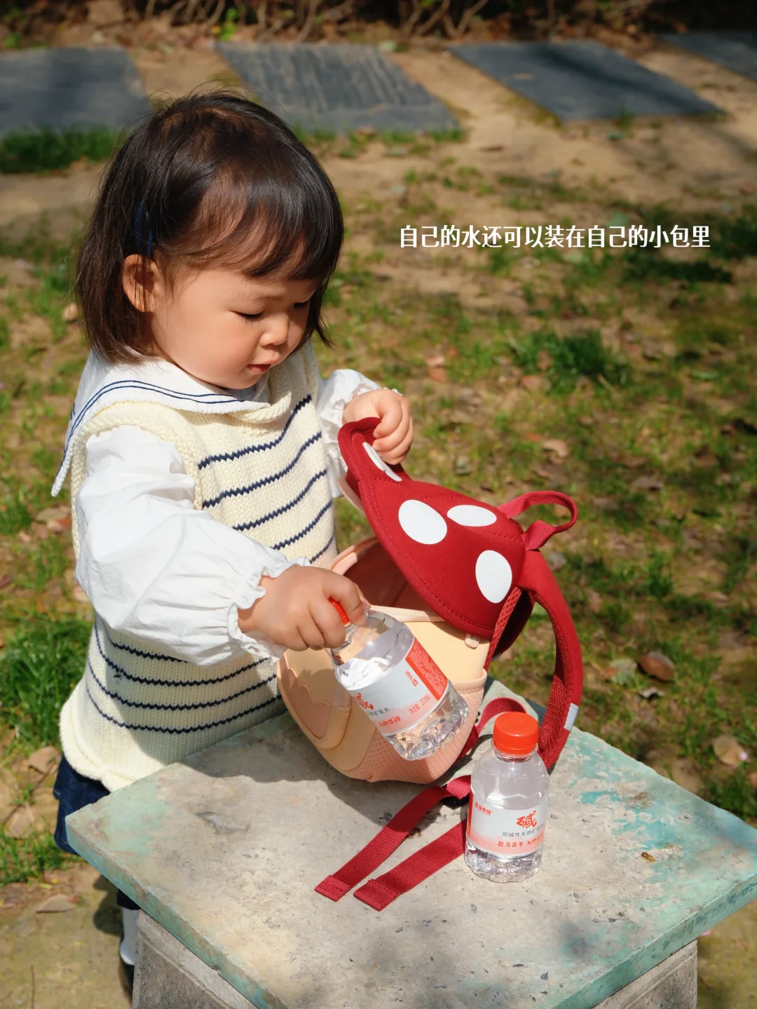 小家伙坐在公园长椅上,自己捧着小水瓶