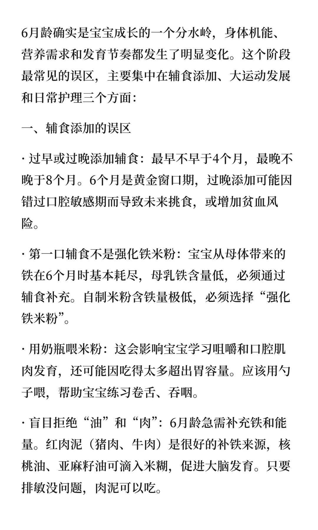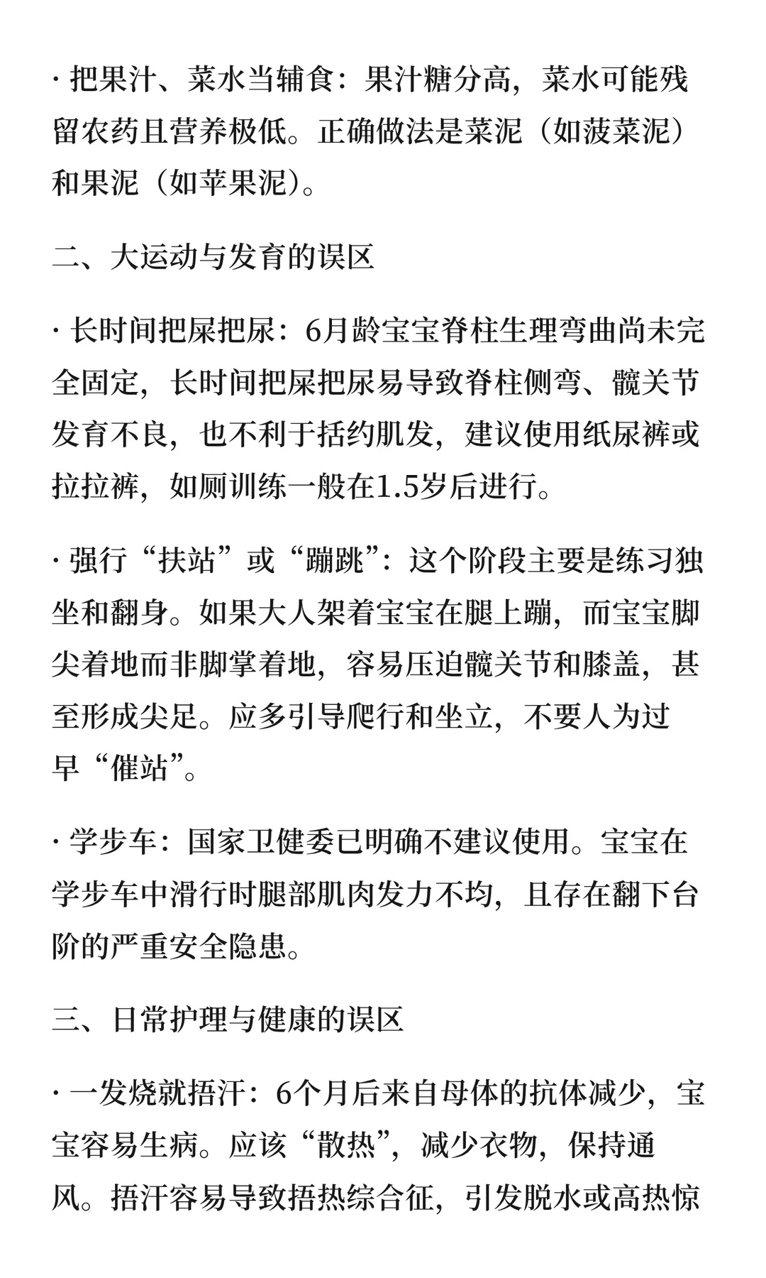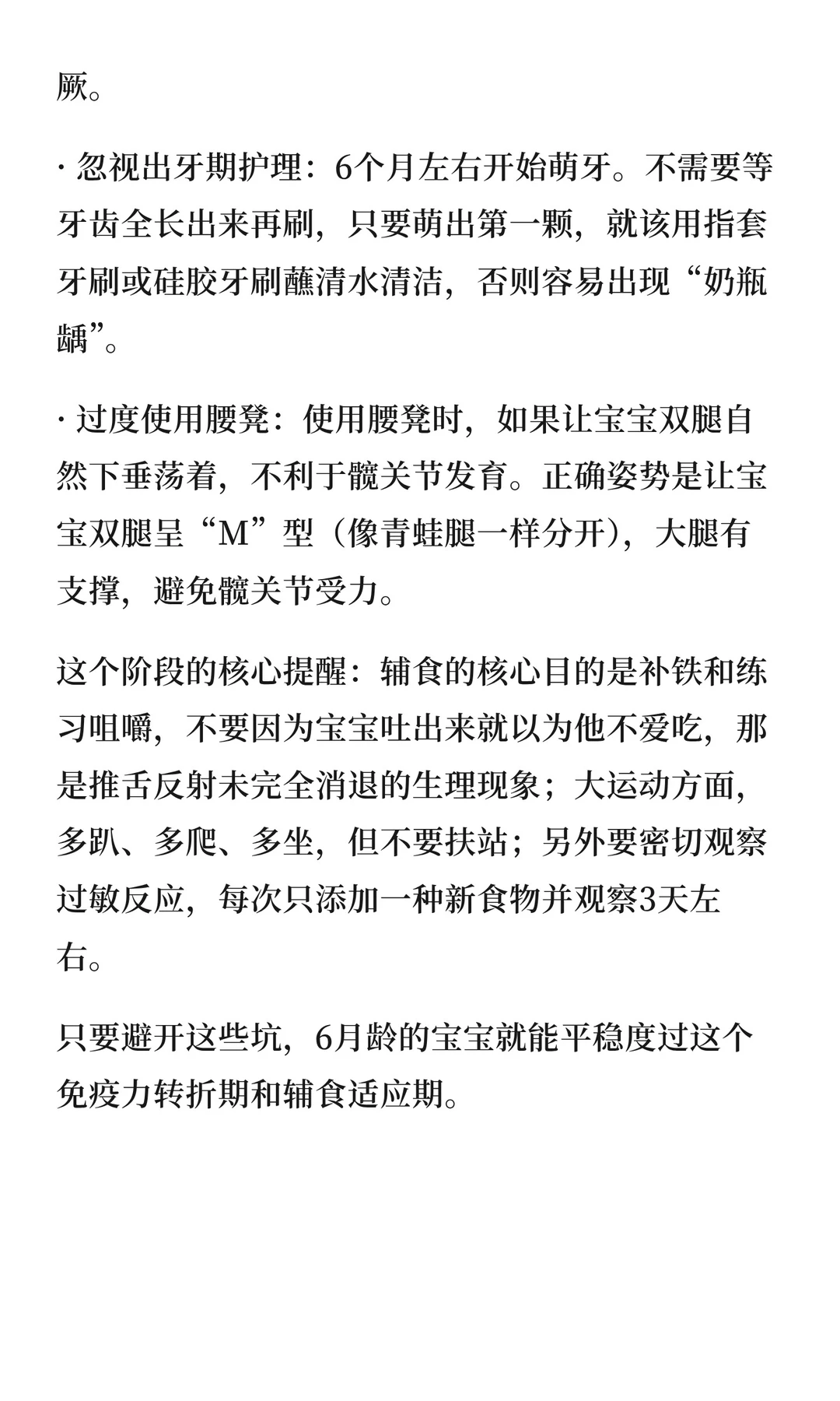 6月龄宝宝辅食应选择强化铁米粉,避免奶瓶喂养,确保铁和能量补充。大运动训练应多趴、多爬、多坐,避免过早扶站或使用学步车。日常护理中,避免一发烧就捂汗,注意出牙期清洁,避免过度使用腰凳。