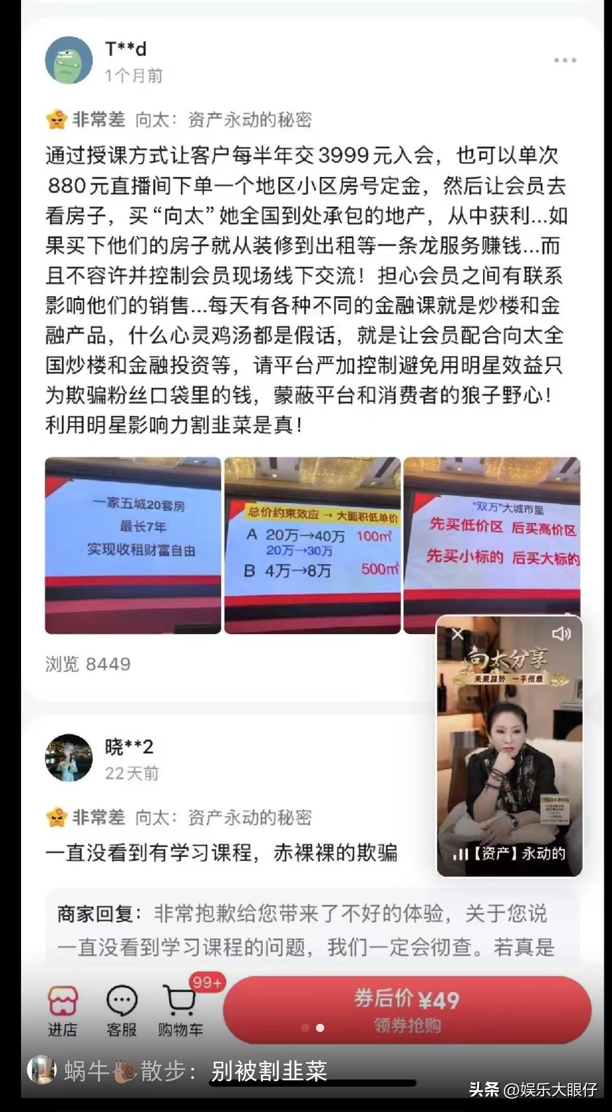 向太在直播间卖的课,被网友投诉,质疑夫妻俩是以卖课的方式搞炒楼和金融投资,总之就是割粉丝的韭菜。 一个小太妹出身的港圈黑白道混成大佬女人的人,卖自己主讲的金融投资课本身就很荒诞,她的资本积累经验哪里是普通人学得来的,何况现在的法制环境,就她那套本事,哪有邪修挣快钱的机会。