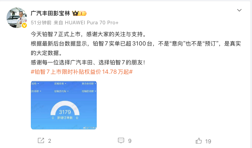 铂智7上市锁单超3100台3月29日铂智7正式发布价格,广汽丰田高管直接在微博晒出品牌内部系统截图,曝光车型当日锁单超3100台。心里没底,真不敢这么晒。这可是后台可查的真实锁单数据,没有半点水分,全是实打实的成交转化。这波操作直白又有说服力,消费者不是不懂车,产品力够、价格到位,后台数字自然会说话。铂智7上市限时补贴权益价14.78万起