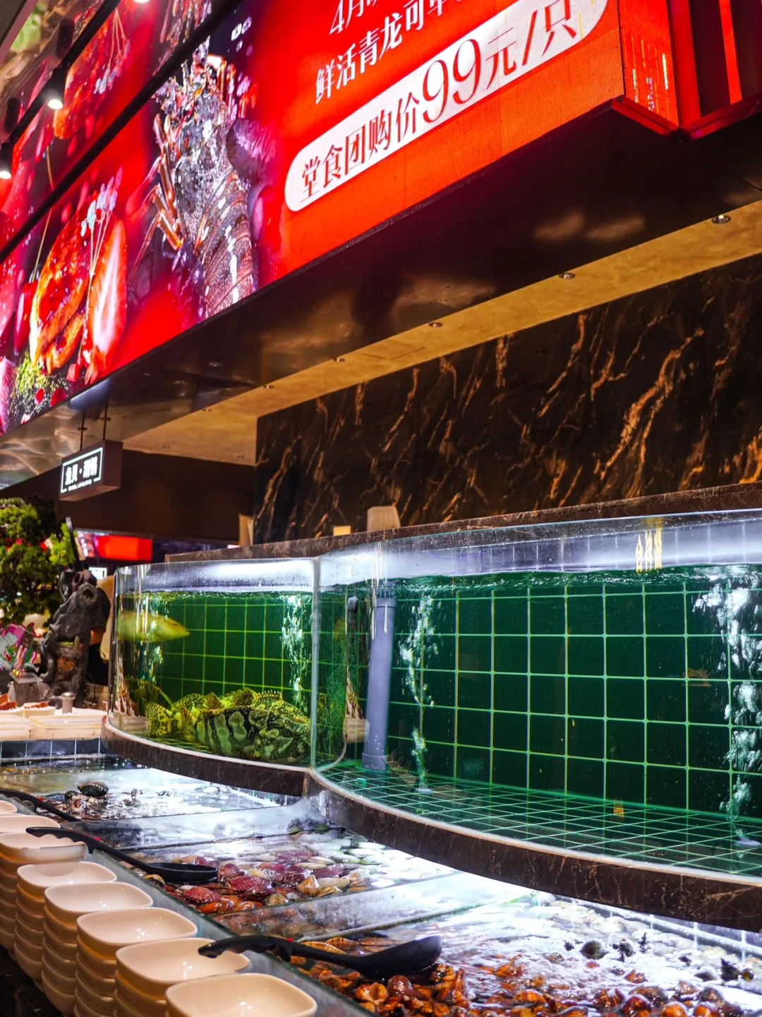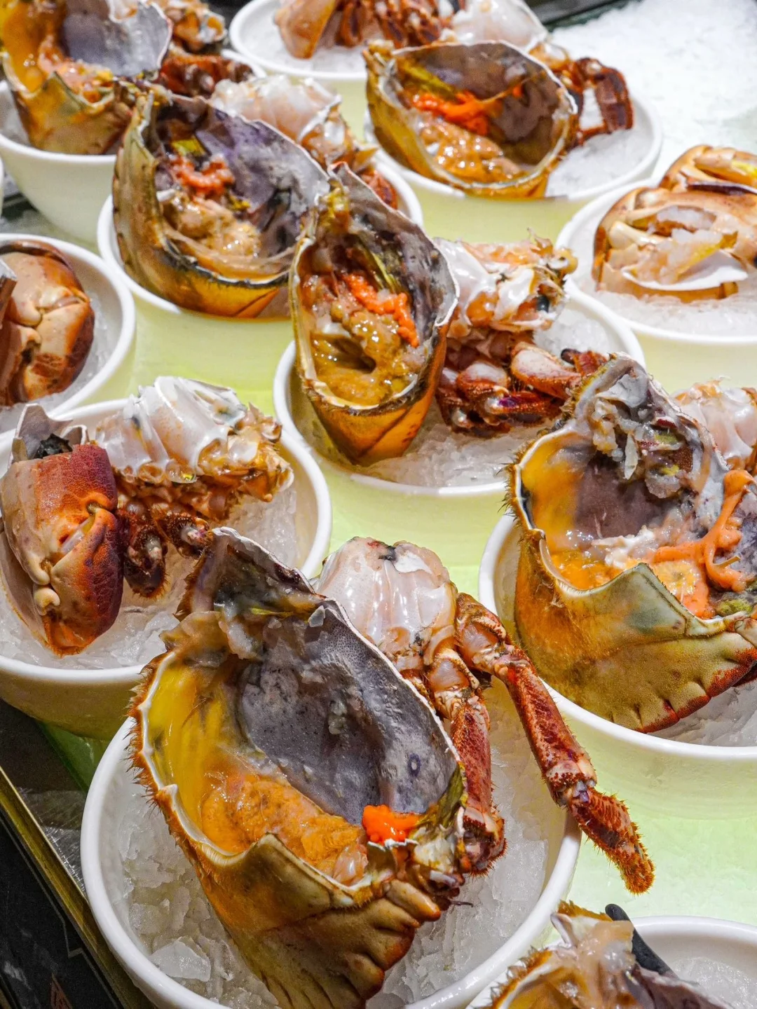 活鲜池是必打卡的第一站,红鲟青膏蟹、鲍鱼、罗氏虾全是活的,自己捞自己煮,新鲜看得见