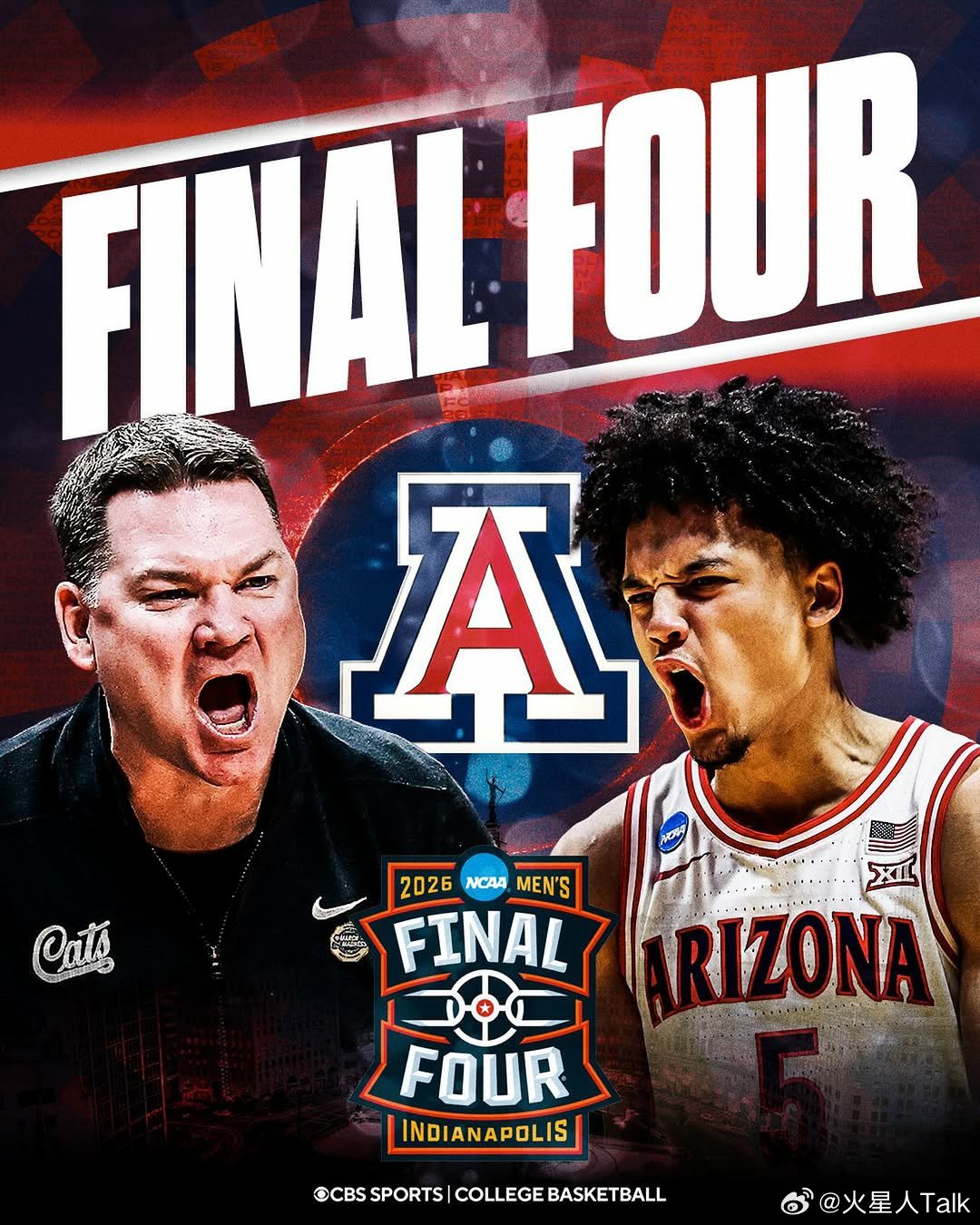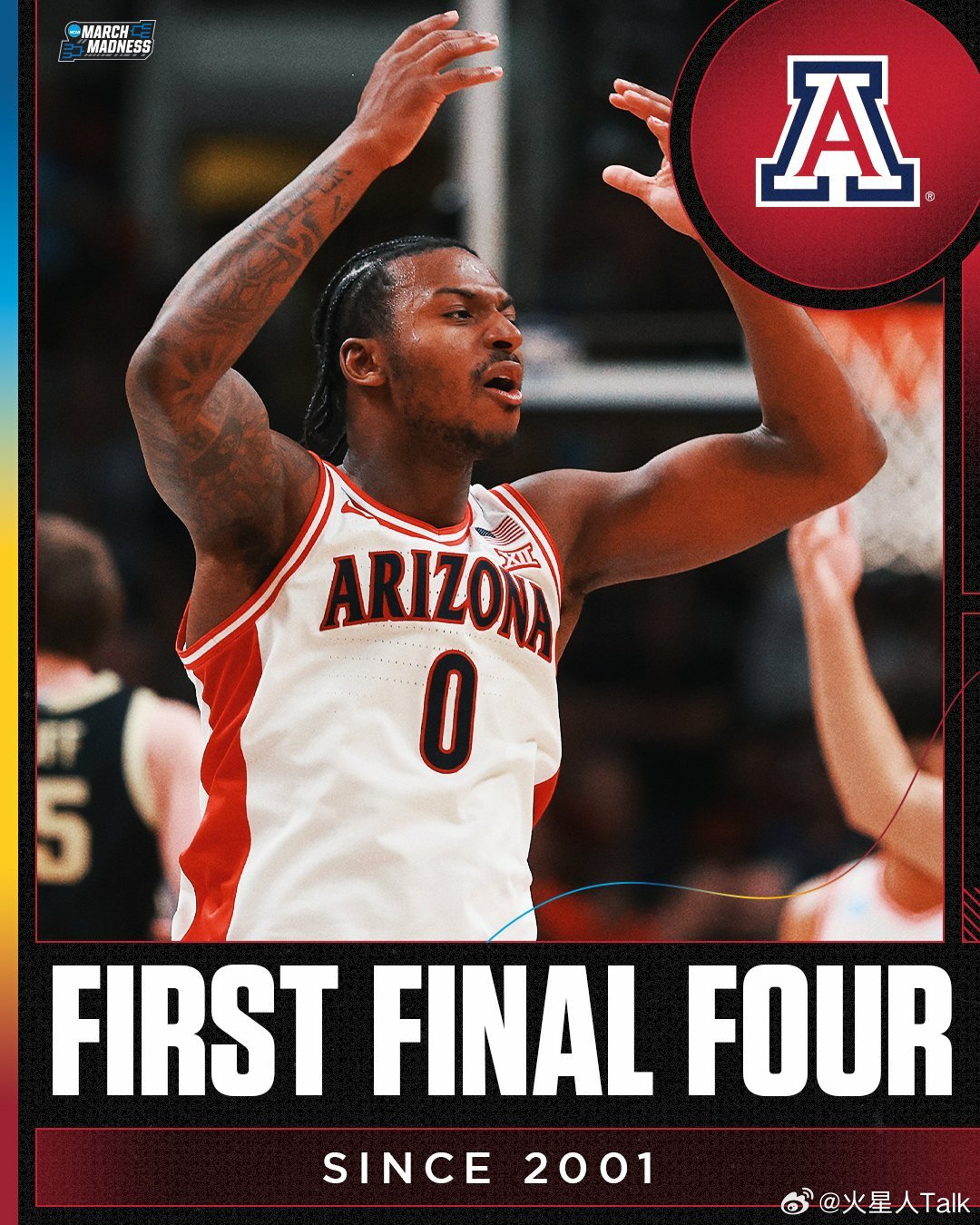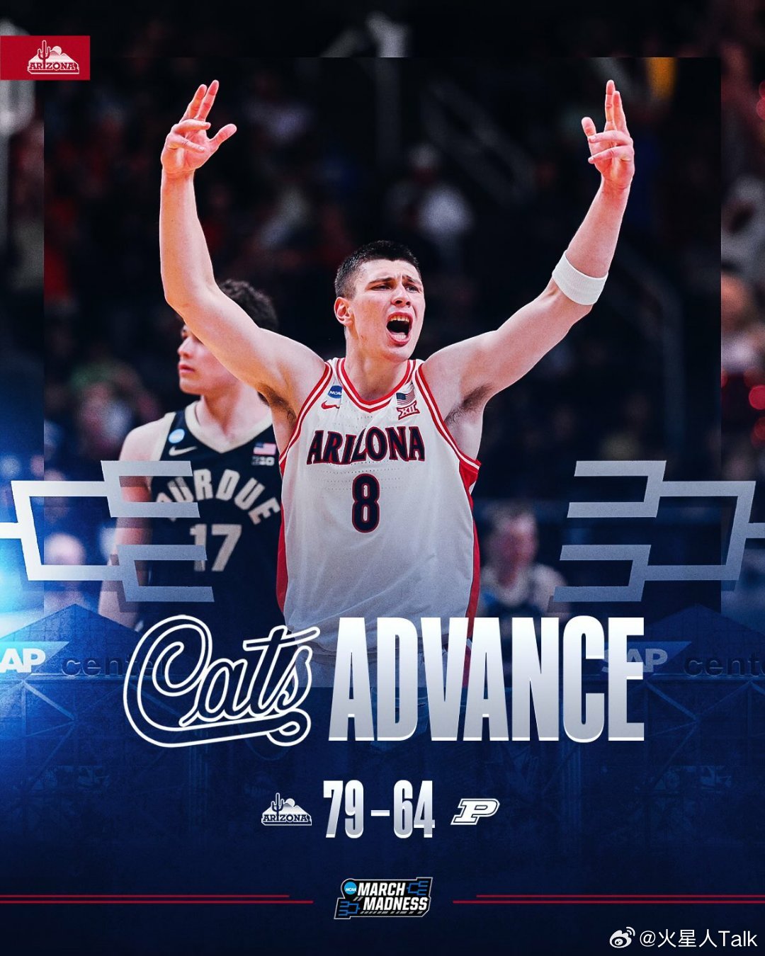 2025-2026赛季NCAA男篮疯狂三月 西区决赛亚利桑那大学击败普渡大学,夺得西区冠军,自2001年以来首次进入最终四强。野猫队Koa Peat18中9,20分7篮板。Ivan Kharchenkov11中7,18分8篮板。Jaden Bradley9中4,14分6助攻Brayden Burries10中4,14分6篮板3抢断。Motiejus Krivas5中1,6分12篮板。锅炉工Braden Smith15中4,13分5篮板7助攻3失误。Oscar Cluff8中4,14分10篮板。Kaufman-Renn14中5,10分。Fletcher Loyer9中3,8分。CJ Cox7分5篮板。