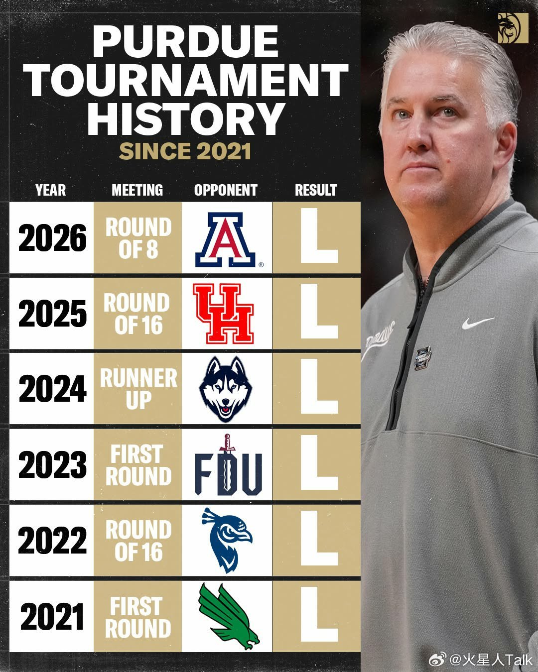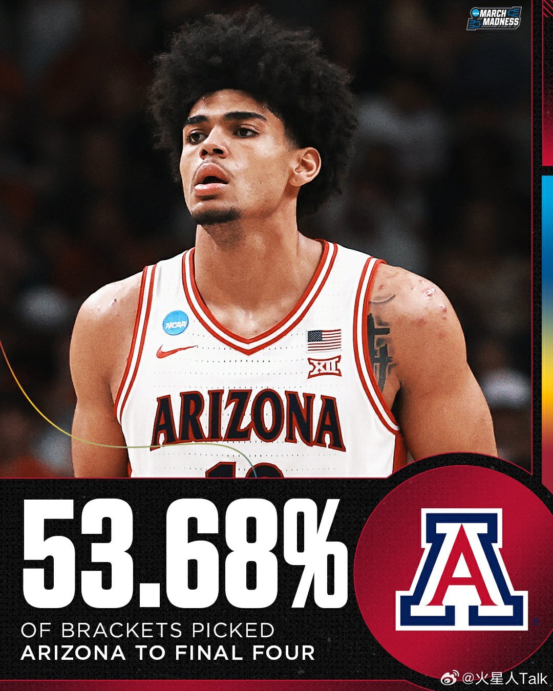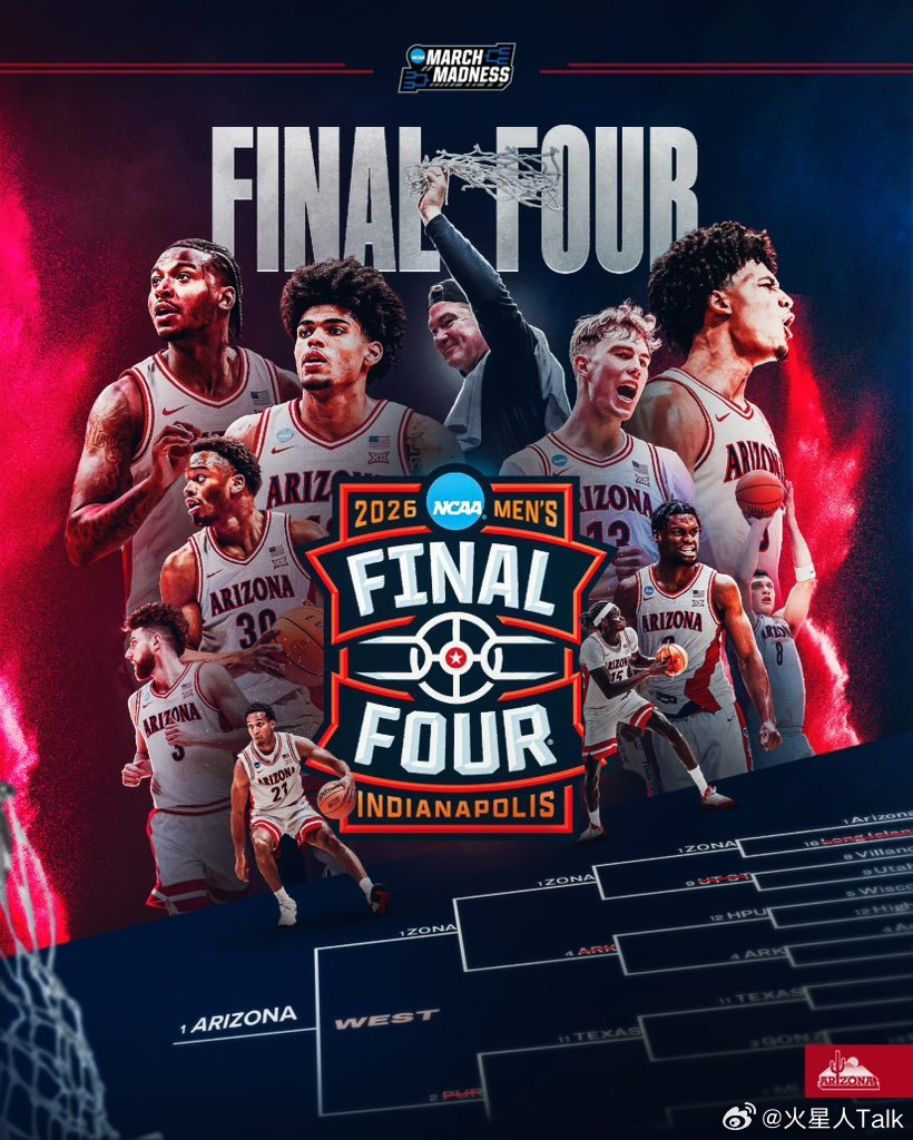 2025-2026赛季NCAA男篮疯狂三月 西区决赛亚利桑那大学击败普渡大学,夺得西区冠军,自2001年以来首次进入最终四强。野猫队Koa Peat18中9,20分7篮板。Ivan Kharchenkov11中7,18分8篮板。Jaden Bradley9中4,14分6助攻Brayden Burries10中4,14分6篮板3抢断。Motiejus Krivas5中1,6分12篮板。锅炉工Braden Smith15中4,13分5篮板7助攻3失误。Oscar Cluff8中4,14分10篮板。Kaufman-Renn14中5,10分。Fletcher Loyer9中3,8分。CJ Cox7分5篮板。