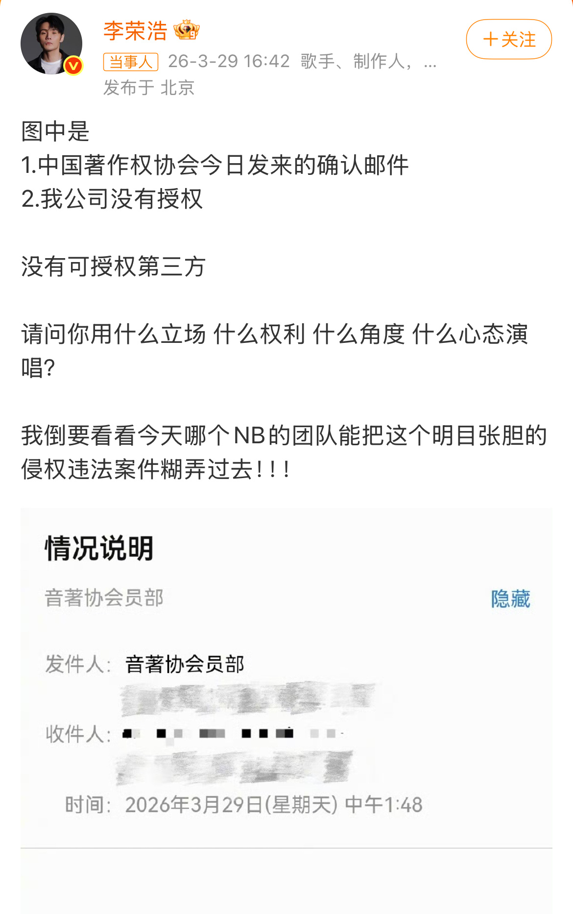笑不活了家人们,李荣浩刚发微博喊话单依纯侵权演唱《李白》,转头就被填词人吴向飞点名,说他自己也没授权就公开唱《路一直在》,还没给使用费。这波属实是“维权反被锤”,版权这事儿果然是环环相扣,谁也别想跑啊!