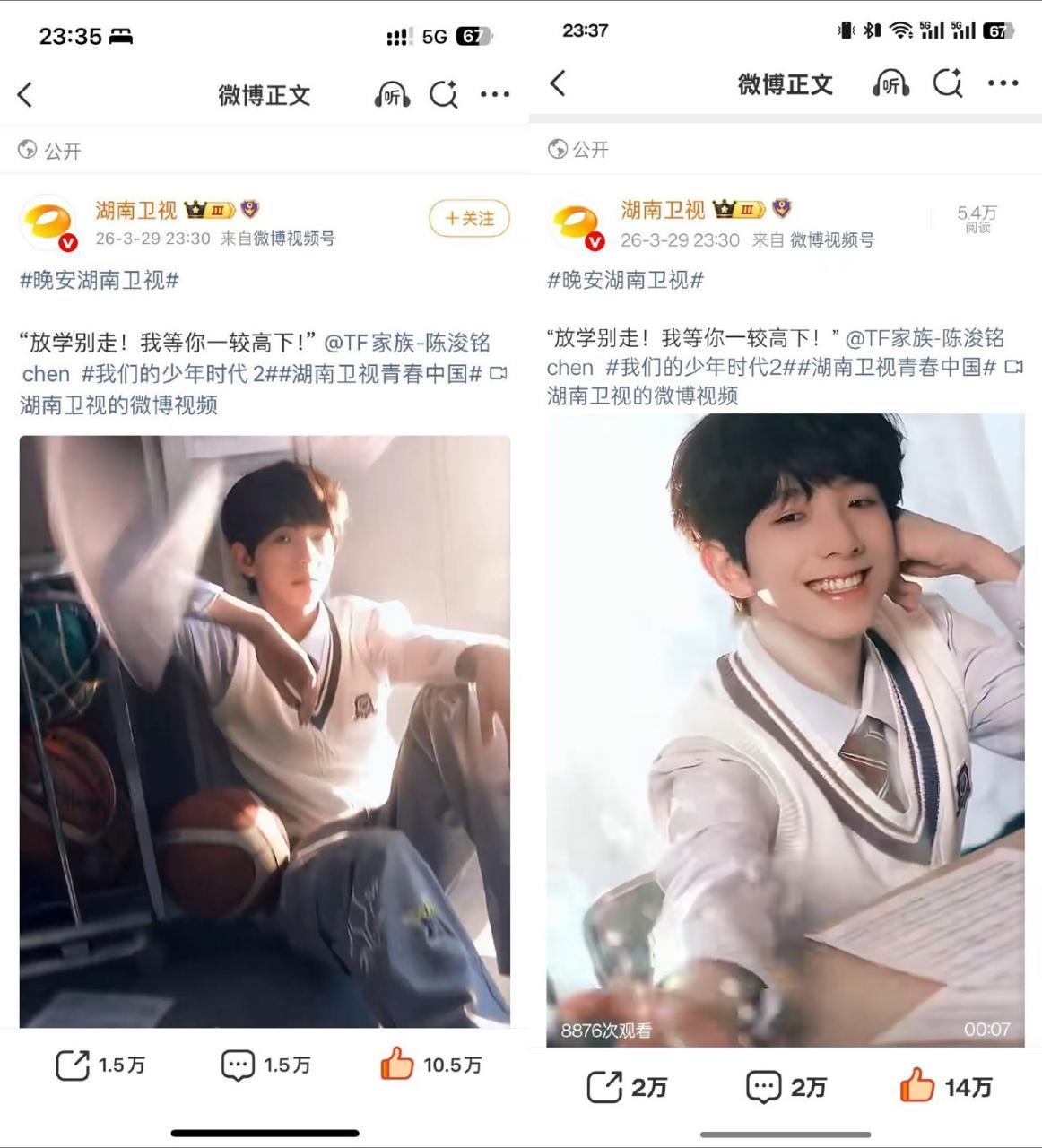 陈浚铭湖南卫视单人宣发3分钟万转 4分钟10w赞5分钟1.5万转 7分钟14万赞