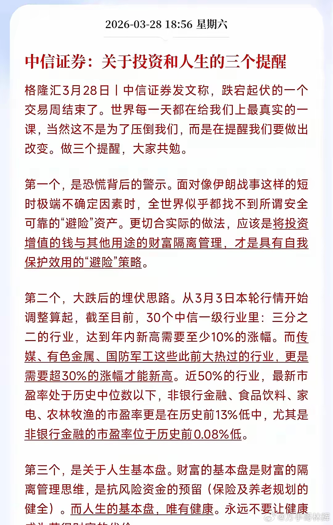 昨天中信证券发布了:关于投资和人生的三个提醒。这次说的很客观,也提示了风险,从这篇文章中我也看到了三个股市里三个动向: