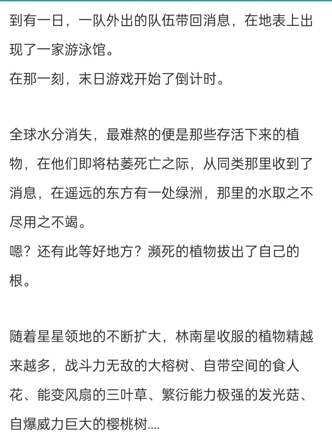 干旱末世下的唯一绿洲。经营的设定真的很吸引人,从预收就开始等 女主的人设不是很讨喜,男主更是不如不存在,感情线莫名其妙的从女主犯花痴开始 但是因为这个设定我实在喜欢,所以可以接受