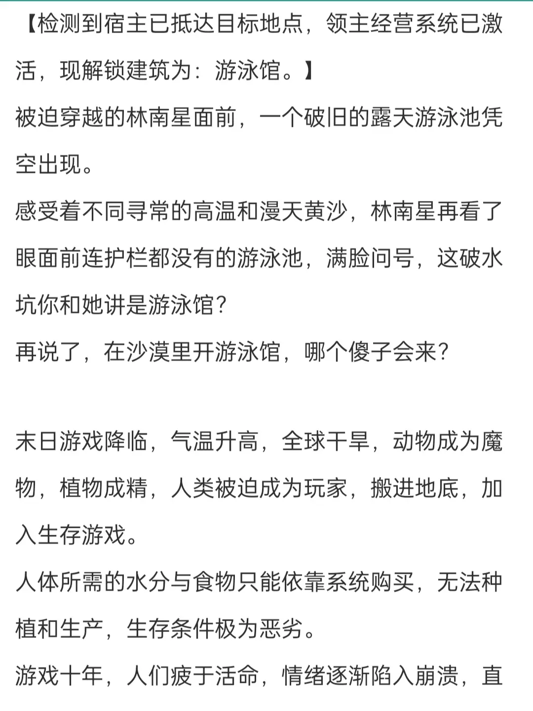 干旱末世下的唯一绿洲。经营的设定真的很吸引人,从预收就开始等女主的人...
