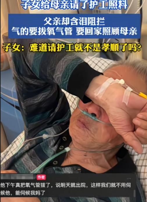 难道请护工照顾母亲就不孝顺吗? 河南,父母俩都生病了,家里4个人都照顾不过来,子女给母亲请了护工照料,但是父亲含泪阻拦,气得要拔氧气管,要回家照顾母亲。 请护工绝对不等于不孝顺。 真正的孝顺,从来不是硬扛着把自己拖垮,而是用最稳妥的方式,让老人得到持续、专业、到位的照顾。 父亲阻拦,是出于本能的爱与不信任:怕外人不上心、怕受委屈、怕没人真心疼,这是老一辈最朴素的执念——只有自己家人守着才叫孝顺。 但事实上家里两个病人,四个人已经分身乏术,再硬熬下去,人累垮了、情绪崩了,反而谁都照顾不好。况且这扎心的现实,能出钱、肯上心、不逃避,已经远超很多人了。 做人不能太自私,要懂得知足、要懂换位思考,体谅对方的不易。子女多去陪护、多盯护工,给足父亲安全感,让他知道请护工不等于不管母亲。而父亲也稍微松松手,别用爱把一家人都逼到绝境。 一家人平安、都能撑下去,比“必须亲手照顾”重要太多。