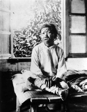 一位罹患麻风病的妇女静静坐在床榻边,她的面部被疾病彻底扭曲,皮肤布满结节与瘢痕,眼睑外翻、口鼻变形,曾经的容貌被病痛吞噬,只留下一双空洞而麻木的眼睛,直直望向镜头,没有悲泣,也没有愤怒,只有被命运碾压后的死寂。 她的双手交叠在腿上,指节肿胀变形,部分手指被布条紧紧包裹,那是麻风病侵蚀神经与骨骼后留下的残缺,每一道褶皱都在诉说着漫长的煎熬。她穿着一件洗得发白的粗布长衫,坐在简陋的木板床沿,身后是一扇木框窗户,窗外的绿植在强光下显得模糊而刺眼,与室内的昏暗形成尖锐对比。光线勾勒出她枯瘦的轮廓,也照亮了那些触目惊心的病灶。