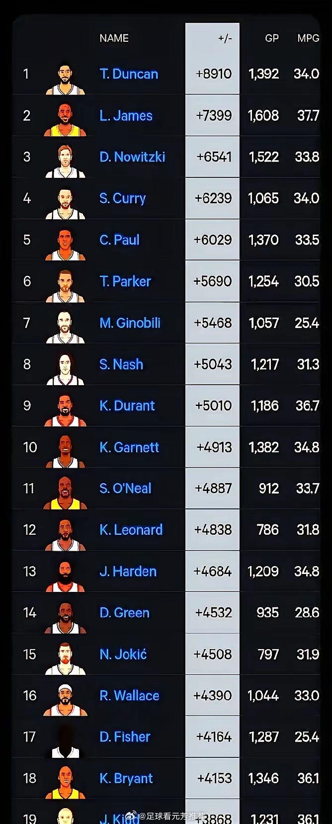 翻看NBA历史正负值榜单,我愣住了。邓肯生涯正负值+8910,稳居榜首!在马刺,他赢球如探囊取物,整个体系都在助力。后来,伦纳德也沾了光。詹姆斯近1600场,正负值也超+7400,堪称胜负天平。库里、诺维茨基也是榜单佼佼者。这数据太直接,谁在场上让球队赢分,谁在刷分,一目了然。职场亦如此,有人KPI亮眼,但团队壮大,往往靠的是那些默默付出的人。nba邓肯