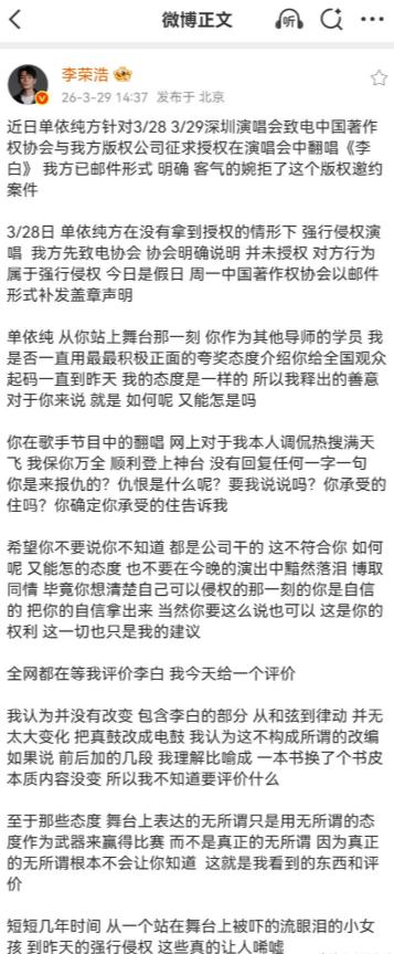 李荣浩,开撕单依纯! 3月29日,一向低调的李荣浩,突然晒出长文,这次他完全不客气,直接喊话单依纯,那么发文的重点到底是什么呢? 3月28日晚,单依纯“纯妹妹2.0”深圳个人演唱会如期开唱,现场座无虚席,歌迷们期待着她带来经典曲目。演唱会进行到中段,单依纯拿起话筒,宣布要演唱一首大家熟悉的歌曲,当熟悉的旋律响起,台下瞬间沸腾,正是李荣浩的代表作《李白》。 而这次演唱,并非简单的翻唱,单依纯依旧沿用了2025年《歌手2025》节目中的改编版本,加入了魔性念白“如何呢?又能怎?”,以及游戏化的编曲元素。没人想到,这场看似正常的演出,会在第二天引爆乐坛,成为一场关于版权、情分与尊重的舆论风暴。 早在演唱会举办前一周,单依纯团队就通过中国音乐著作权协会,正式向李荣浩的版权公司提交了《李白》的商业翻唱授权申请,明确说明仅在3月28日、29日两场深圳演唱会中演唱一次。 李荣浩团队收到申请后,考虑到此前单依纯改编《李白》引发的全网争议,以及对作品版权的严格把控,于3月27日通过邮件明确、客气地婉拒了授权请求,还特意附上“希望理解,后续有合适机会再合作”的友好表述。按照行业惯例,授权被拒后,艺人及团队应立即调整演出曲目,避免侵权风险。 但3月28日晚,单依纯还是在未获任何授权的情况下,登台演唱了《李白》。李荣浩团队通过现场歌迷的直播片段、社交平台的演出视频,第一时间发现了这一情况,随即联系中国音乐著作权协会核实。 音著协在电话中明确回复,从未就该场次演唱向单依纯团队或主办方发放任何授权,此次行为属于“强行侵权”,并于3月29日上午出具了加盖公章的正式书面声明,确认侵权事实。 3月29日14时37分,李荣浩在个人微博发布长文,完整披露事件经过,言辞恳切却态度坚决。他在文中明确指出,单依纯的行为是明知授权被拒后的强行侵权,触碰了音乐版权的底线。 他回忆起两人的过往交集,2020年《中国好声音》舞台上,单依纯凭借《永不失联的爱》惊艳全场,彼时李荣浩作为导师,因战队名额已满未能转身,但始终公开夸赞她的音乐天赋,称其选歌智慧、动态音域控制力出色,节目结束后也一直以行业前辈的身份关注、提携她。 2025年《歌手2025》中,单依纯改编《李白》引发全网调侃,甚至出现“亵渎原作”的争议热搜,李荣浩为了保护后辈,选择沉默,没有公开批评,默默为她挡下全网非议,只希望她能专注音乐成长。 让李荣浩心寒的是,自己的善意与包容,换来的却是单依纯改编版中那句“如何呢?又能怎?”的轻蔑,以及此次明知侵权仍执意演唱的漠视。 他在长文中直言,单依纯的改编并非真正的艺术创新,只是换了编曲、加了念白,和弦与律动都未突破原框架,如同“只换书皮未改内核”,既不尊重原创作品,也不尊重舞台与观众。 他还直接警告,不要以“公司行为”“团队沟通失察”为借口甩锅,艺人作为演出主体,必须为舞台上的每一个行为负责,也不要试图用落泪博同情的方式公关,要直面侵权事实。 长文发布后,迅速登上微博热搜榜首,全网热议。16时16分,单依纯在微博发文道歉,称“正在了解情况,会和团队尽快搞清楚状况,给大家一个答复”,并表示“深知版权意识的重要性,会把红线标清”。但这份道歉并未直面核心侵权问题,也未承认个人责任,被网友质疑是模糊回应、回避问题。 16时42分,李荣浩再次发文,直接晒出音著协的官方确认邮件,用四连问强硬回应:“请问你用什么立场、什么权利、什么角度、什么心态演唱?”他直言,倒要看看哪个团队能把这种明目张胆的侵权违法案件糊弄过去,态度坚决,没有丝毫妥协。 邮件中清晰写明,针对单依纯深圳演唱会使用《李白》的行为,音著协未发放任何授权,也不存在可代为授权的第三方机构,这份官方实锤,彻底击碎了“授权流程误会”的说法。 事件发酵后,音乐行业内也引发广泛讨论。多位音乐版权律师表示,商业演出中翻唱他人作品,必须获得著作权人授权,单依纯的行为已违反《著作权法》第三十八条,需承担相应法律责任。 不少音乐人发声支持李荣浩,认为原创版权是行业底线,不容践踏,前辈的提携与善意,更不该被肆意消耗。 而单依纯的部分粉丝则认为,翻唱是对作品的传播,李荣浩没必要小题大做,但这种观点很快被多数网友反驳,认为版权保护与作品传播并不冲突,侵权就是侵权,不能用传播为借口开脱。 从《中国好声音》的前辈赏识,到《歌手》改编的默默维护,再到此次侵权事件的彻底决裂,李荣浩与单依纯的关系,从温情提携走到公开对峙,背后是原创版权的坚守、行业规则的捍卫,也是情分被消耗后的失望。 李荣浩的长文,不仅是对单依纯侵权行为的控诉,更是对整个音乐行业版权意识的提醒,对原创者权益的守护。