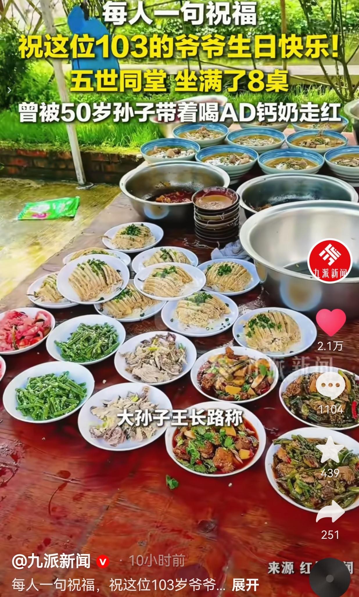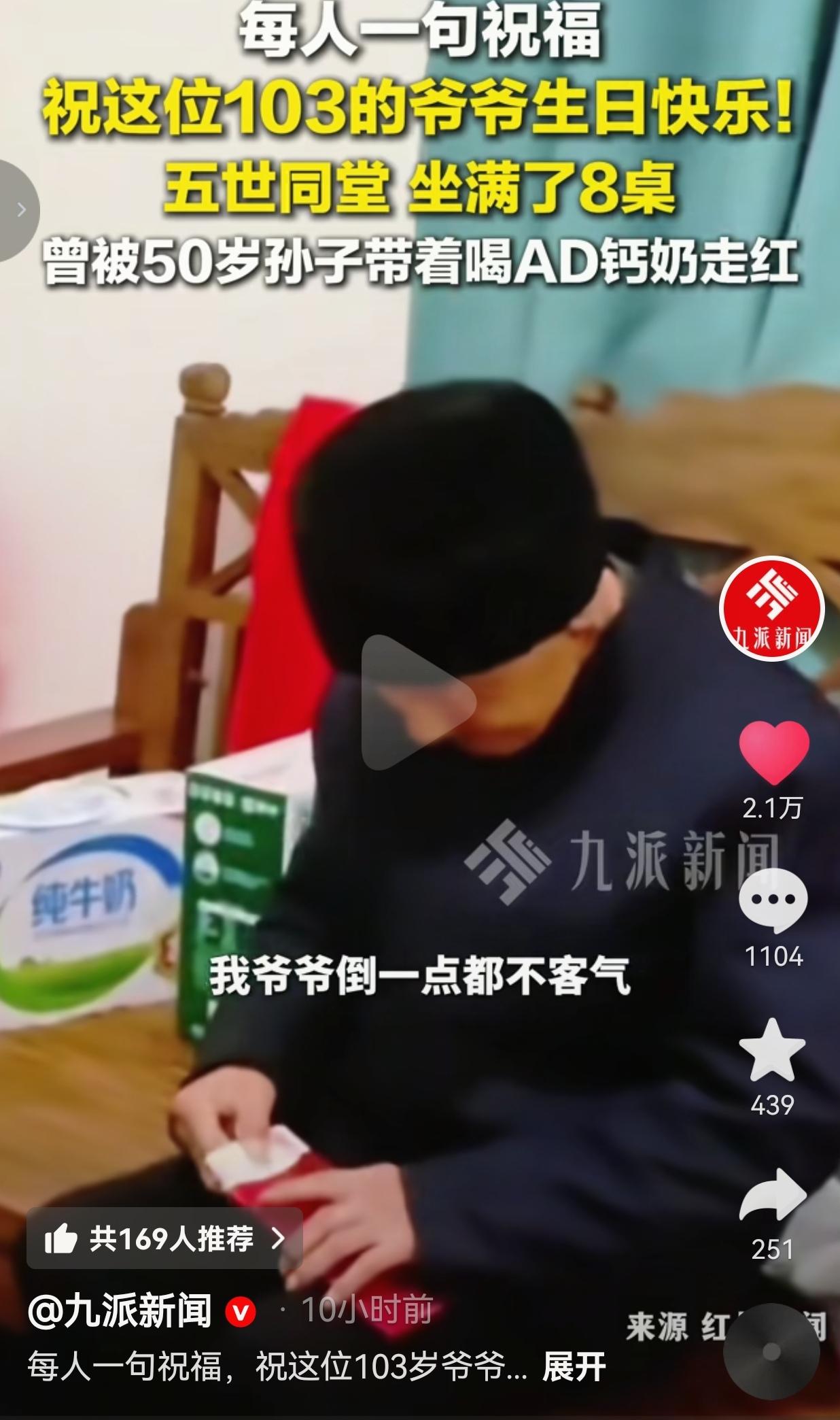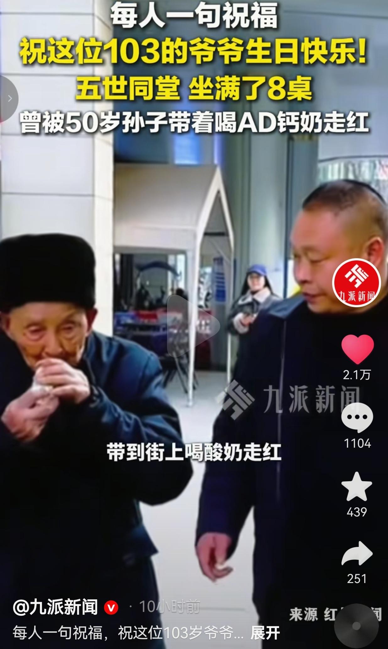 103岁爷爷五世同堂过生!被50岁孙子拽着喝AD钙奶走红,不收礼只收祝福,看完直接破防! 四川大竹的王家华爷爷,今年刚满103岁,之前就因为被50多岁的大孙子王长路拽着逛大街、喝AD钙奶火了一把。 你敢信?这个孙子自己都当爷爷了,还像哄小孩一样,搀着爷爷的胳膊在闹市街头走,手里举着小奶瓶,凑到爷爷嘴边喂他嘬,俩老头一个拄拐一个扶腰,嘬得津津有味,那画面直接戳中了无数人的泪点。 这次过103岁生日,家里直接摆了8桌流水席,从曾孙到玄孙,五世同堂挤得满满当当,连隔壁村的亲戚都赶过来凑热闹。 爷爷爱热闹,早早就坐在院子里的竹椅上,戴着黑帽子裹着围巾,笑得眼睛都眯成了一条缝,看着晚辈们忙前忙后端菜倒酒,嘴里还不停念叨:“人多好,人多热闹!” 更让人暖到心窝子的是,爷爷早就跟家里人打好招呼:只收祝福不收礼!可架不住晚辈们心疼,还是有人偷偷塞红包。 有个重孙女递过去红包,爷爷一点都不“客气”,接过来就坐在椅子上一张一张数钱,皱巴巴的手指扒拉着钞票,嘴里还念念有词,旁边的重孙女笑得直不起腰:“我爷爷数钱比谁都认真!” 可谁能想到,这个能坐8桌、能数红包、能跟孙子抢AD钙奶的百岁老人,骨子里藏着最纯粹的温柔——他怕给孩子们添麻烦,连过生日都反复强调“别破费”,只盼着一家人能凑在一起说说话;就像平时出门,他总攥着孙子的衣角,不是怕走丢,是怕自己走慢了耽误孙子的事,可孙子偏要搀着他慢慢逛,告诉他:“不急,我陪你。” 网友看到后评论说:“我奶98岁,也爱跟我抢AD钙奶!百岁老人的快乐真的好简单,就是有人把他当小孩疼!” 也有的网友说:“五世同堂坐8桌!这才是中国人最想要的福气啊!比赚多少钱都强!” 还有的网友说:“爷爷数钱的样子太可爱了!嘴上说不收礼,身体却很诚实,这才是真实的老人,不装!” 也有的网友说:“之前刷到他跟孙子喝AD钙奶的视频,现在又刷到过生日,这爷爷太让人羡慕了!50岁了还有爷爷陪着,这才是最大的底气!” 我看完视频直接破防了!有人说“百岁老人都是宝”,可我更想说,能把百岁老人当“宝”疼的晚辈,才是真的金不换! 50岁的孙子还能拽着103岁的爷爷逛大街、喂AD钙奶,这哪里是“带老人出门”,分明是把爷爷当成了需要哄的小朋友——怕他闷,怕他孤单,怕他觉得自己是累赘,所以用最笨拙的方式告诉他:“你永远是我们家的宝贝,我还能陪你走很久。” 更戳人的是爷爷数红包的样子:他不是贪钱,是在确认“我还被人惦记着”;他不是不懂事,是在享受这份被晚辈疼爱的滋味。 我们总说要孝顺,可真正的孝顺哪里是给多少钱、买多少东西?是愿意蹲下来陪他喝一瓶AD钙奶,是愿意听他絮叨半天陈年旧事,是愿意在他过生日时,把一大家子人都凑到他面前,告诉他:“你看,我们都在,你永远不是麻烦。” 那些说“老人太固执”“太麻烦”的人,根本不懂:百岁老人的每一次笑、每一次闹,都是在跟这个世界说“我还爱着你们”;而那个50岁还搀着爷爷走路的孙子,用行动告诉我们:被爷爷疼过的孩子,终于长成了能疼爷爷的大人。 现在的我们,总忙着赚钱、忙着打拼,把“没时间”挂在嘴边,可忘了家里的老人,盼的从来不是我们的钱,而是我们的人。 103岁爷爷的8桌寿宴,不是炫耀,是提醒:家人闲坐,灯火可亲,才是这辈子最珍贵的财富。 他被50岁孙子拽着喝AD钙奶的样子,告诉我们:爱从来不分年龄,把老人当小孩宠,才是最高级的孝顺;而能在50岁时,还能牵着爷爷的手走在大街上,本身就是这辈子最值得炫耀的事。 百岁人生不是传奇,50岁还能喊一声“爷爷”,才是这辈子最牛的福气! 对此,你怎么看?