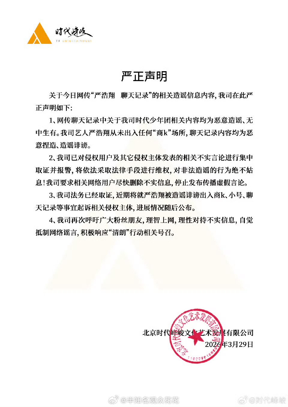时代峰峻维权声明到达时代峰峻回应网传严浩翔聊天记录时代峰峻将起诉造谣严浩翔相关侵