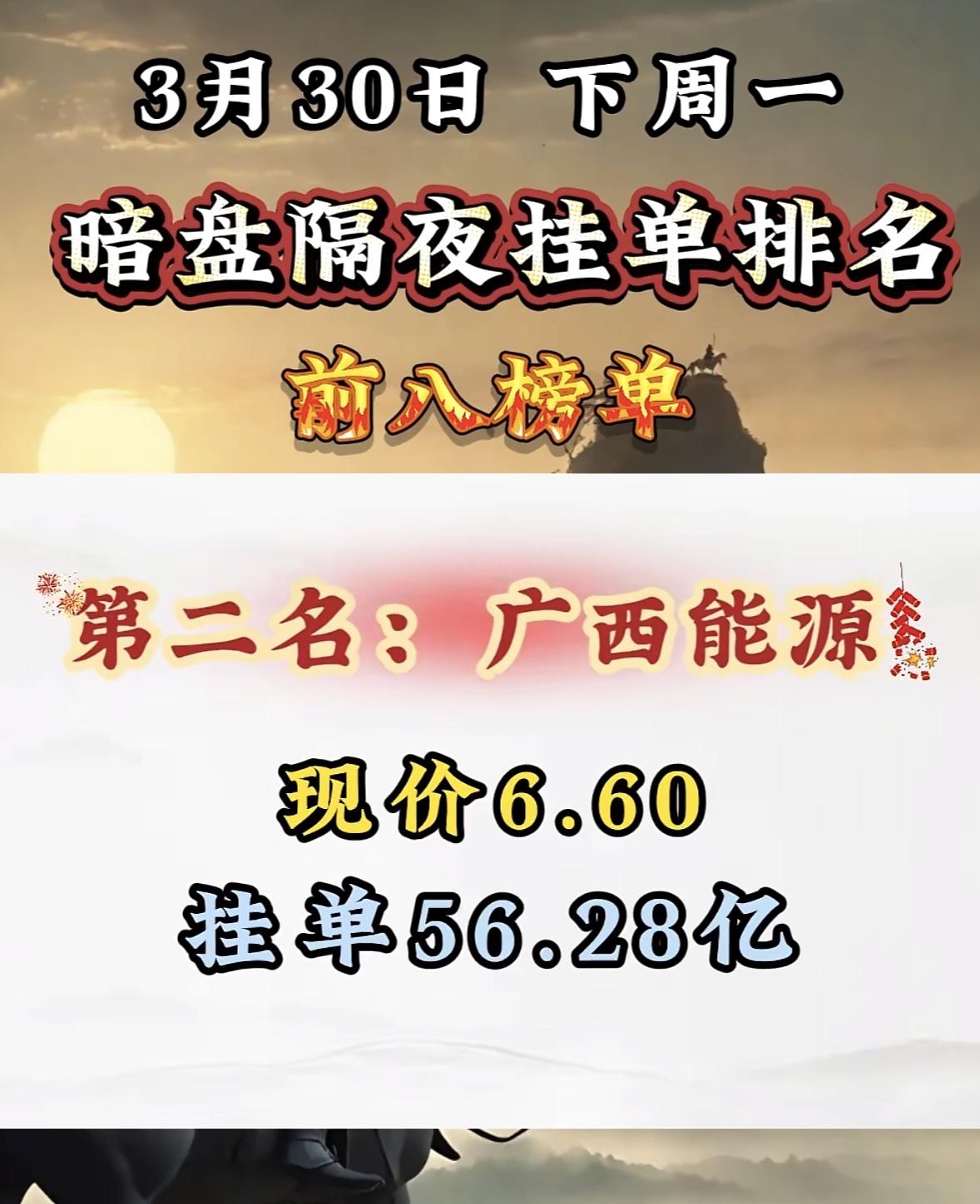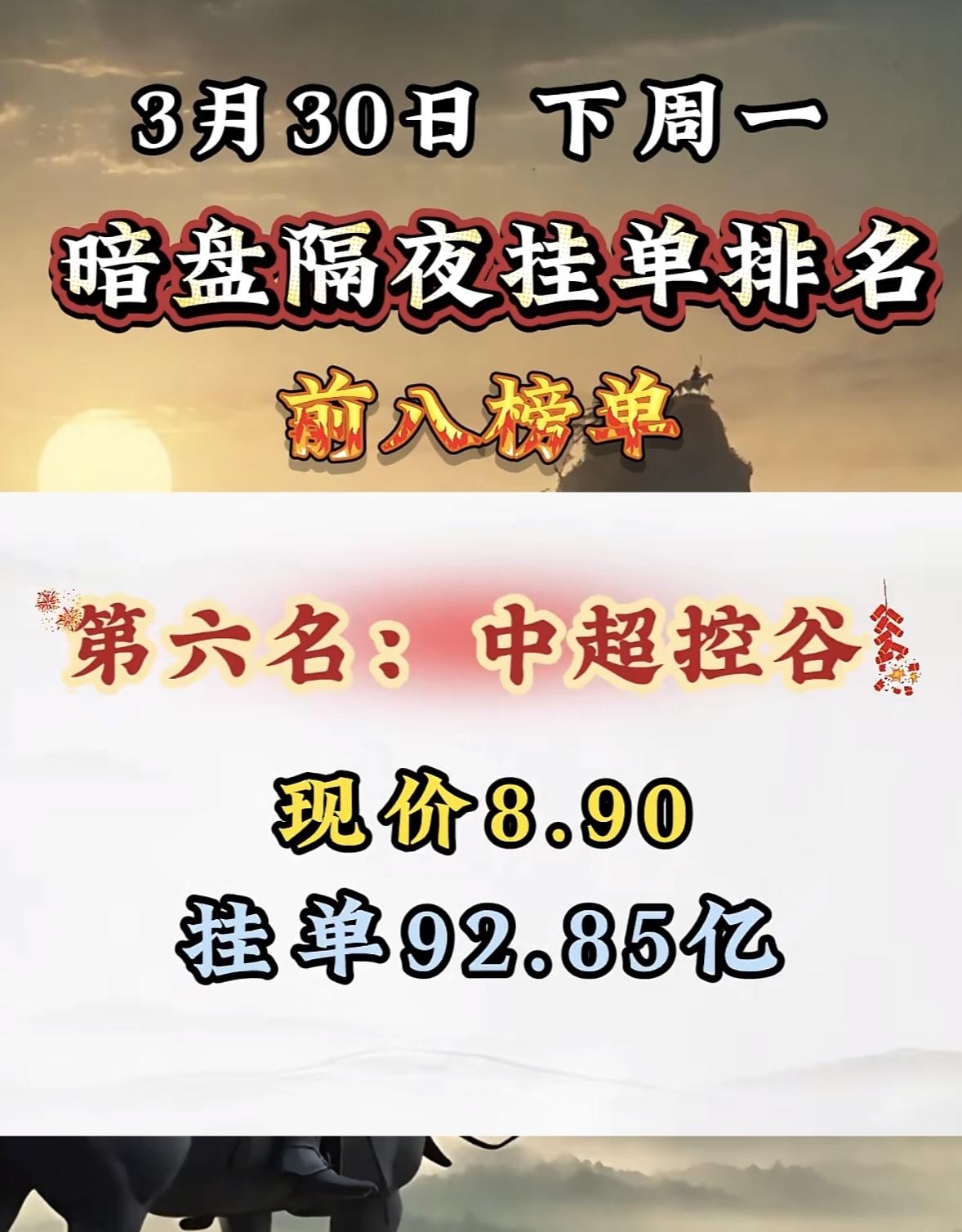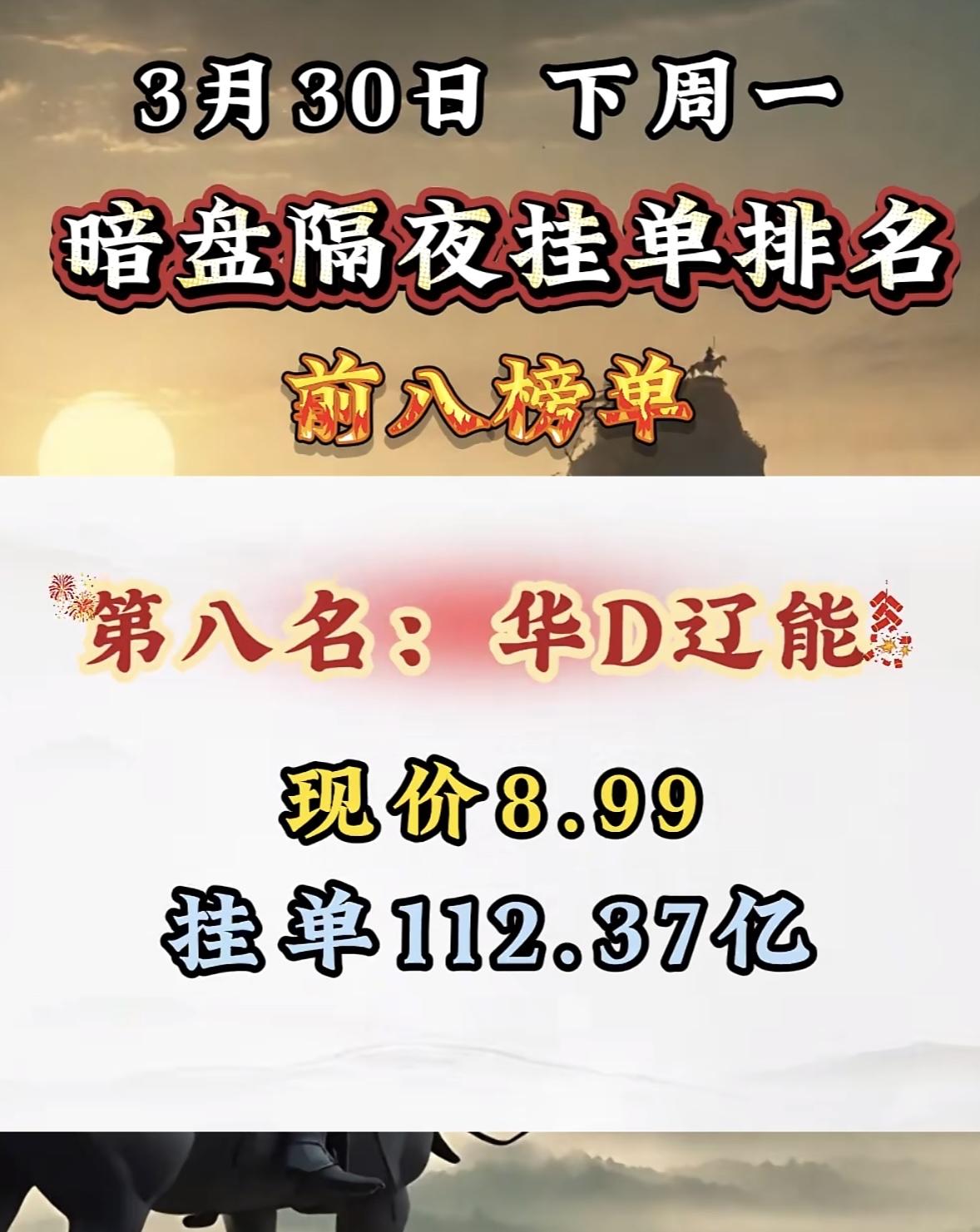 3月30日周一暗盘隔夜挂单排行榜出炉 华电辽能这次可太猛了!现价8.99,挂单竟达112.37亿,强势冲进暗盘隔夜挂单排行。对比3月26日的数据,华电能源现价6.77元,隔夜挂单76.38亿;3月27日中超控股现价8.76,挂单56.29亿,广西能源现价6.00,挂单64.73亿,晋控电力现价4.63,挂单72.80亿,华电辽能这挂单量远超它们。在电力板块里,华电辽能还是领涨的。不过得清楚,挂单量只是参考,市场变幻莫测,股价不一定就涨。但这么大的挂单量,肯定吸引很多资金关注,值得咱们多留意。