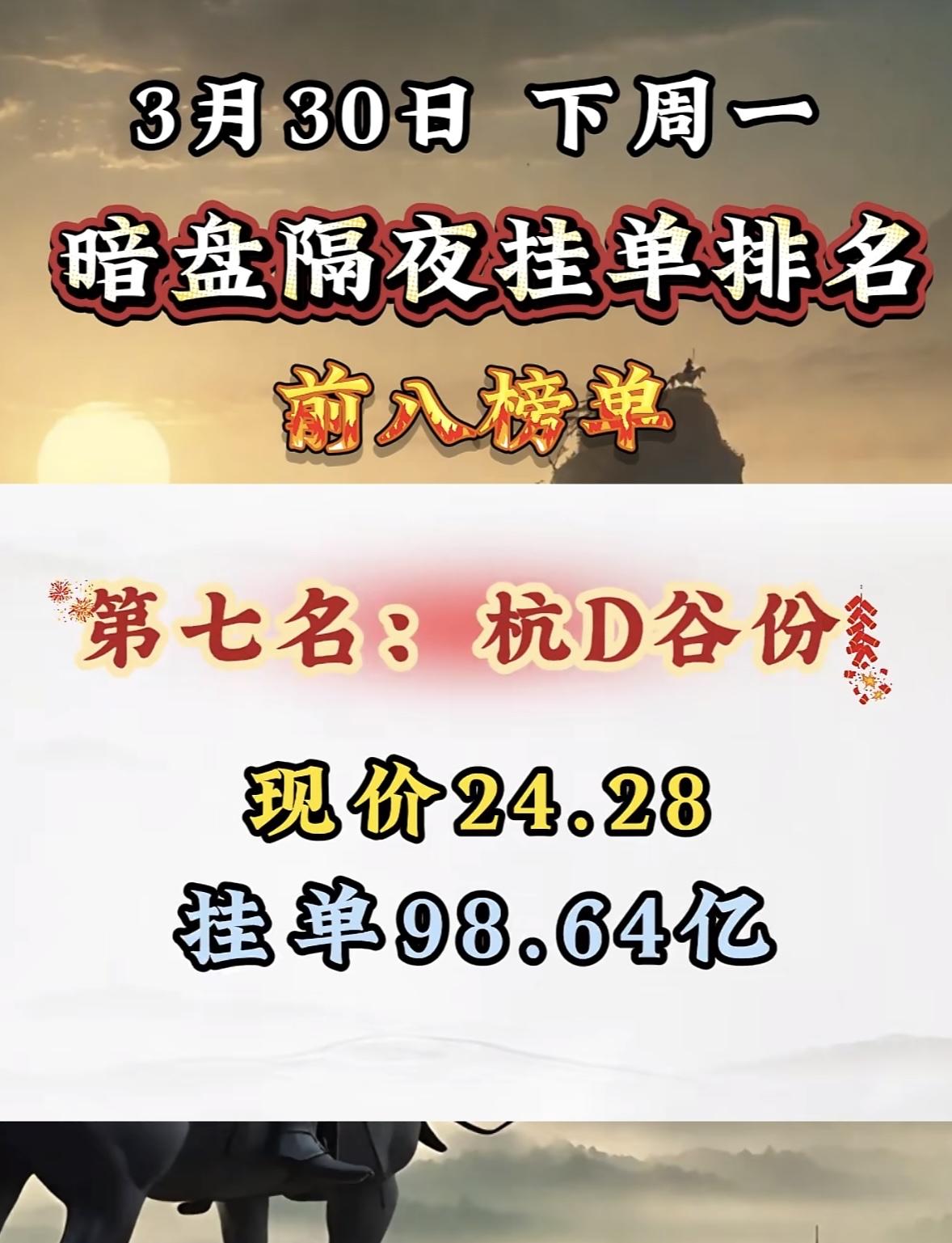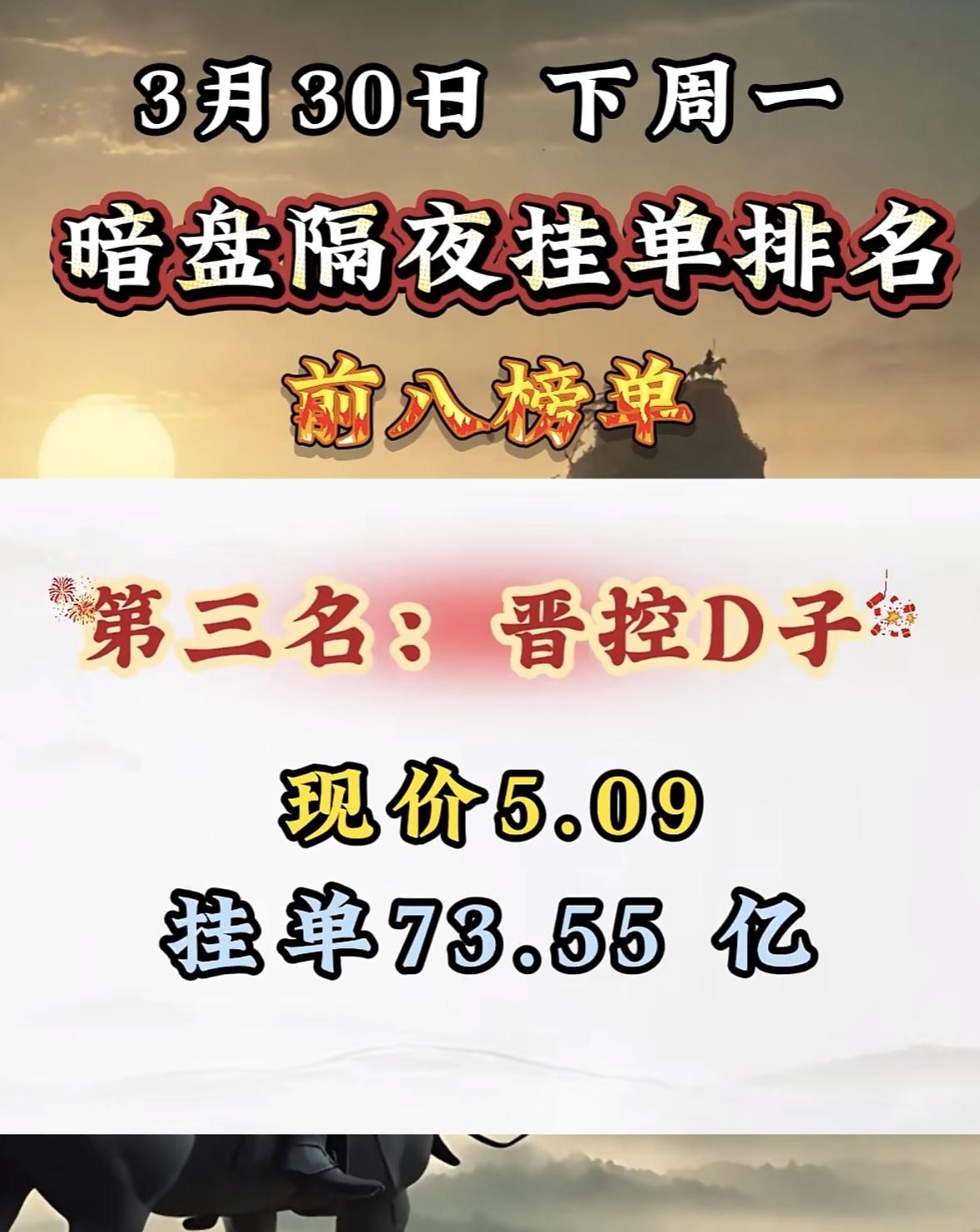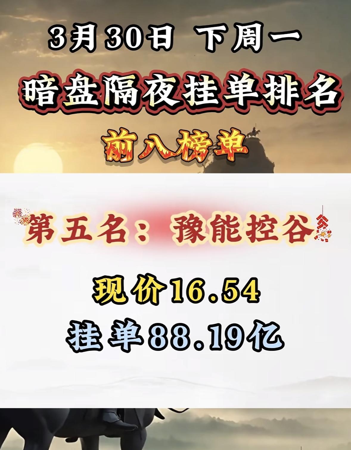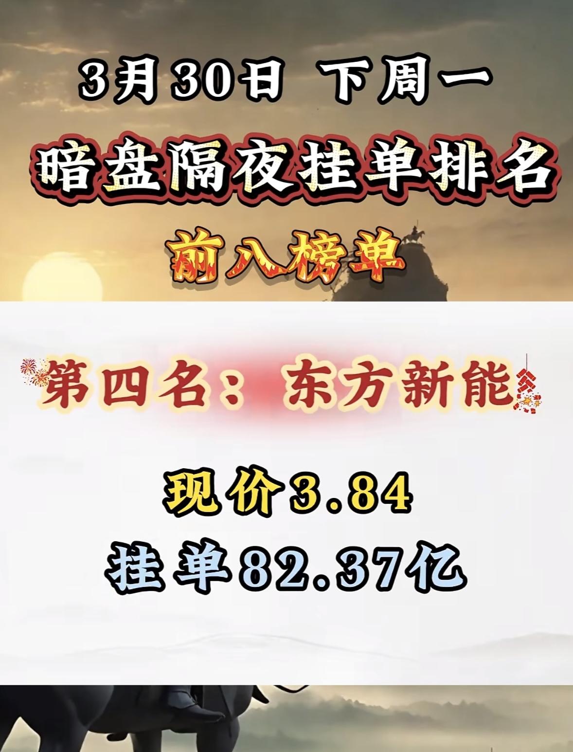 3月30日周一暗盘隔夜挂单排行榜出炉 华电辽能这次可太猛了!现价8.99,挂单竟达112.37亿,强势冲进暗盘隔夜挂单排行。对比3月26日的数据,华电能源现价6.77元,隔夜挂单76.38亿;3月27日中超控股现价8.76,挂单56.29亿,广西能源现价6.00,挂单64.73亿,晋控电力现价4.63,挂单72.80亿,华电辽能这挂单量远超它们。在电力板块里,华电辽能还是领涨的。不过得清楚,挂单量只是参考,市场变幻莫测,股价不一定就涨。但这么大的挂单量,肯定吸引很多资金关注,值得咱们多留意。
