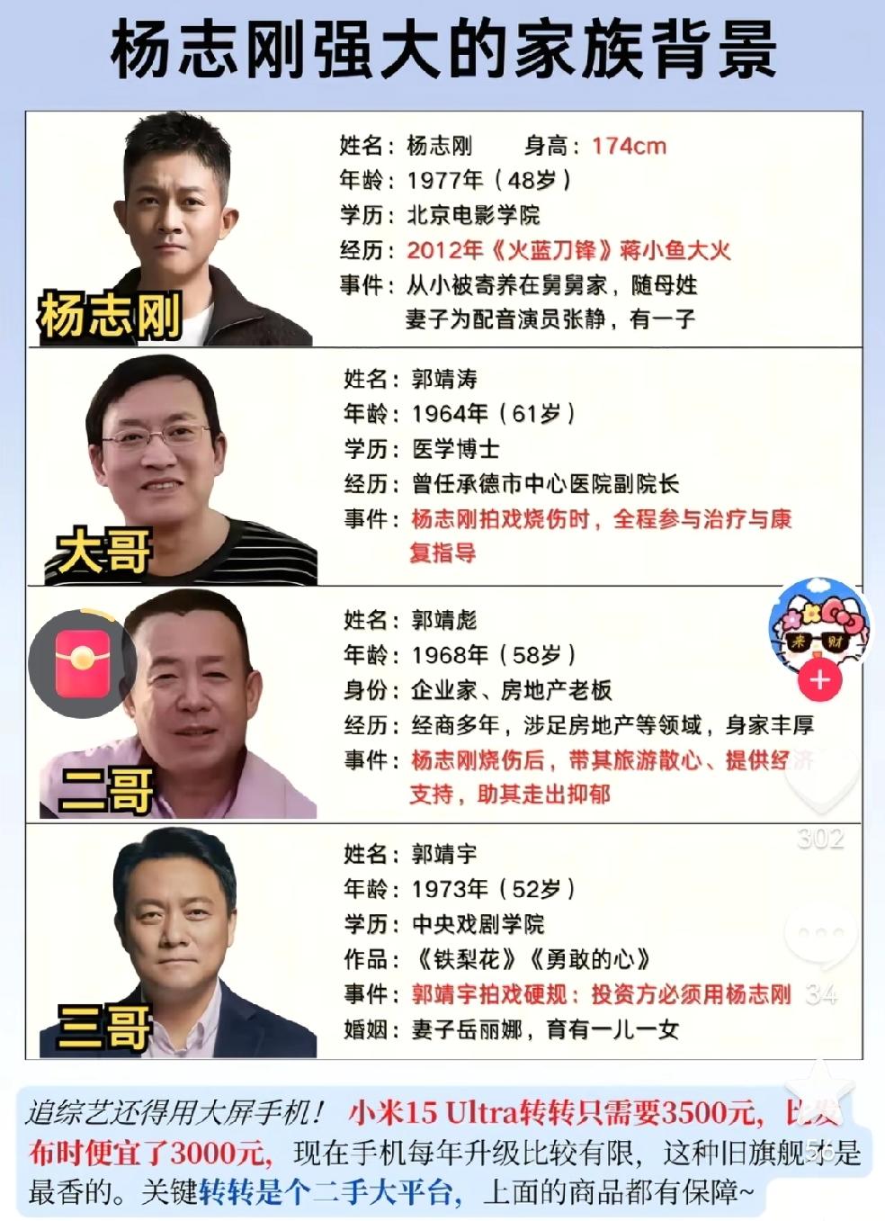 导演杨靖宇说:我在网上有二个标签。第一个就是刚,因为那些年我怼完电视台怼平台,怼完平台再怼电视台,所以,大家都说我是个挺刚的人。 第二个标签就是宠弟狂魔,第一次看到这4个字,把我给气坏了,谁是魔呀?气得我想立即冲出去,把他怼回去。 身边的人抓住我,对我说:导演,这是好词,夸你呢!这叫柔情标签。 我想,怎么刚着刚着又柔上了,敢情之前说我“挺刚,挺的是杨志刚啊。” 大家不知道的是,我之前找杨志刚拍戏还是有好处的。 那时候,我只是个小导演,组里有两个大腕,总是迟到,也不听我说戏,我是骂也不好骂,说也不知道怎么说。 有一天,机会来了。杨志刚也迟到了,我噌的一下就窜了起来。冲到摄像机的旁边,把那个铁的摇杆拿下来。 我拿着铁摇杆追着杨志刚打,满片场的跑。我一边追,嘴巴还在喊:你给我站住。 心里其实是这么想的,弟弟,你快点跑,别让我追上你。万一追上了,今天的苏无名,就是一个瘸子了。 经此一役,组里的大腕再也不敢迟到了,我的恶名也传了出去。江湖都说:郭靖宇导演,不管主角是谁,“主打”的都是他弟。 郭靖宇在演艺圈还是很成功的,他身兼导演、编剧、监制多种职务于一身,如今,还是长信影视传媒的老板。 他捧自己的亲弟弟,那真的是捧得理直气壮,也是为数不多敢公开承认关系,还把它拿到台面上说的人。 他多次大方表示:“别说我弟(指杨志刚)有演技,就算是票房和收视毒药也要用他,不用他就是对不起祖宗,对不起爹娘。” 在郭靖宇的眼里,弟弟是千般好,首先是听自己的话,让他学跳舞,他就考上了河北艺校,苦练6年,还跳上了央视春晚的舞台,证明能吃苦;让他转行学表演,他也能考上北京电影学院,证明有实力。 而且,弟弟很好用,在自己面前,不敢耍大牌;兄弟合作,没有经纪人在中间搅和;给他多少片酬,全看自己的心情,挣得多就多给点,挣得少就少给一点。不管自己怎么做,弟弟都不会有怨言。 本人只是很好奇,郭靖宇提到的两个爱迟到的大腕到底是谁。后来,看完杨志刚的访谈,才有点明白了。 演员杨志刚说:我在郭靖宇面前很自卑,他既是编剧又是导演,性格是那么的开朗,事业又做得那么成功,周边有那么多朋友,心还那么大。 他这个人大大咧咧的,有什么说什么,我很敏感,什么事都压在心里,天天在家琢磨,琢磨来琢磨去,这个事还是解决不了。 跟口若悬河的郭靖宇相比,我这个人嘴笨,一紧张还结巴。思维逻辑还不缜密,脑子经常断片,说着说着,一片空白,就说不下去了。 郭靖宇总是对我说,一直觉得亏欠我,我说,你只比我大几岁,又不是你把我送出去的。不过我能够体会他的苦心。这份情感郭靖宇做得还是相当的极致。 老天爷把我们生下来,一个是那样的(有能力),我就是躲在他身边,这样的。 刚开始(跟郭靖宇合作)的时候,我哥对我的态度还是挺恶劣的。拍《龙虎人生》的时候,我因为迟到,他要打我,他拿什么打我呢?他拿摄像机的那个摇杆打我,越多人拦着他,他越要打我。幸亏他胖,跑不过我。 后来,我拍他的一个戏叫《秘密图纸》,我受伤了,从那以后,他再给我说戏的时候,和颜悦色多了。 随着我翅膀硬了之后,我们在现场有了矛盾,对戏的理解不同,我也敢说出我的意见了。 而且,杨志刚除了郭靖宇这个三哥外,还有二个亲哥哥,难怪杨志刚会说,我从小集万千宠爱于一身,大哥是医学博士、二哥做生意、三哥才是郭靖宇,我活得就像是短剧的主角,短剧的名字我都想好了:《摊牌了,我的三个哥哥是大佬》。