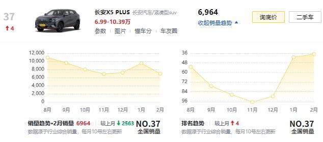 说到长安汽车,更多焦点放在了CS75和逸动身上,其实,还有一款宝藏车型,就是X5plus。 这款车可以说是各项全能: 价格不高,6.99万起个; 动力不弱,搭载的蓝鲸1.5T发动机,当然迎合小手动挡的消费者,也推出了1.5L手动挡车型。 空间不小,轴距,车宽是保证。 销量不低,2月份卖了6964辆。 他和UNI-T同期上市,UNI-T停产了,他依然热销,就是他综合实力的表现。