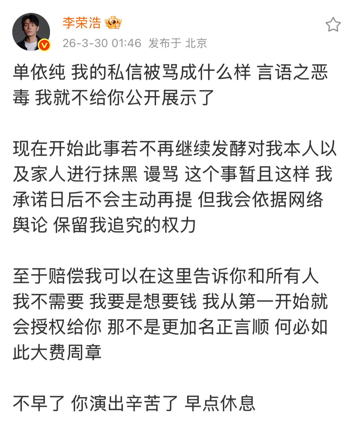 李荣浩凌晨1点46分再发文,说若此事不再发酵以及对我本人和家人抹黑谩骂,此事暂且这样并承诺以后不会再提。 3月30日一大早,李荣浩在个人社交平台第六次发文,就歌手单依纯在没有经过其授权的情况下擅自演唱其作品《李白》进行回应。他说,虽自己的私信被很多人用恶毒的语言攻击,但自己的态度是,从现在开始,若此事不再发酵以及对自己本人和家人抹黑谩骂,此事暂且这样并承诺以后不会再提,但会保留追究权利。同时,他还说,自己这么做不是为了赔偿也并非是为了钱,如果为钱的话,就提前授权了。 看来,李荣浩一方已对此事有了一个明确的态度,事情若不再发酵,就不再追究、不要赔偿。维护自身的合法权益是必须的,任何人不能擅自侵犯其他人的合法权益。为避免类似问题发生,事前一定要做到提前沟通,在得到对方同意才能实施,这也是最起码的程序和尊重。