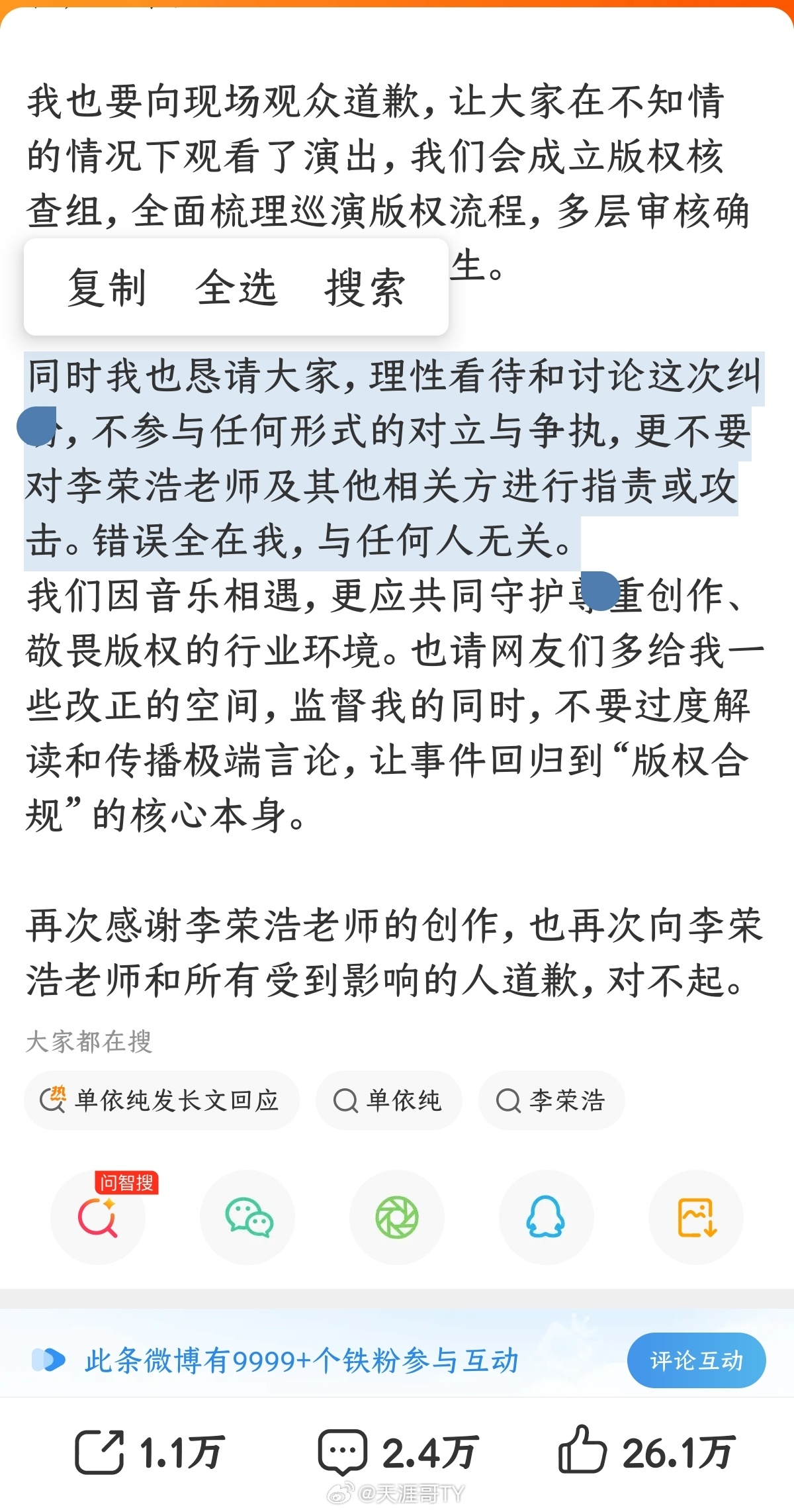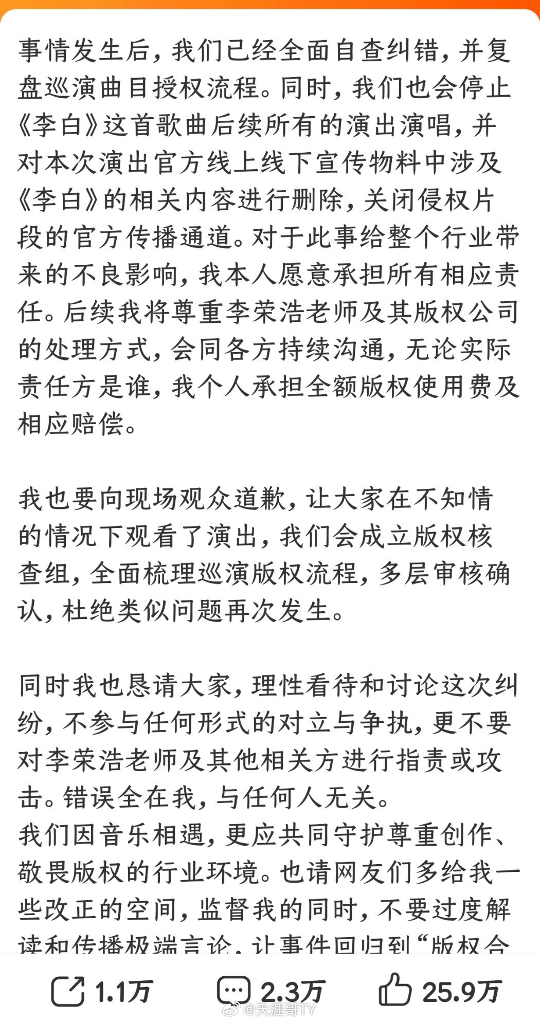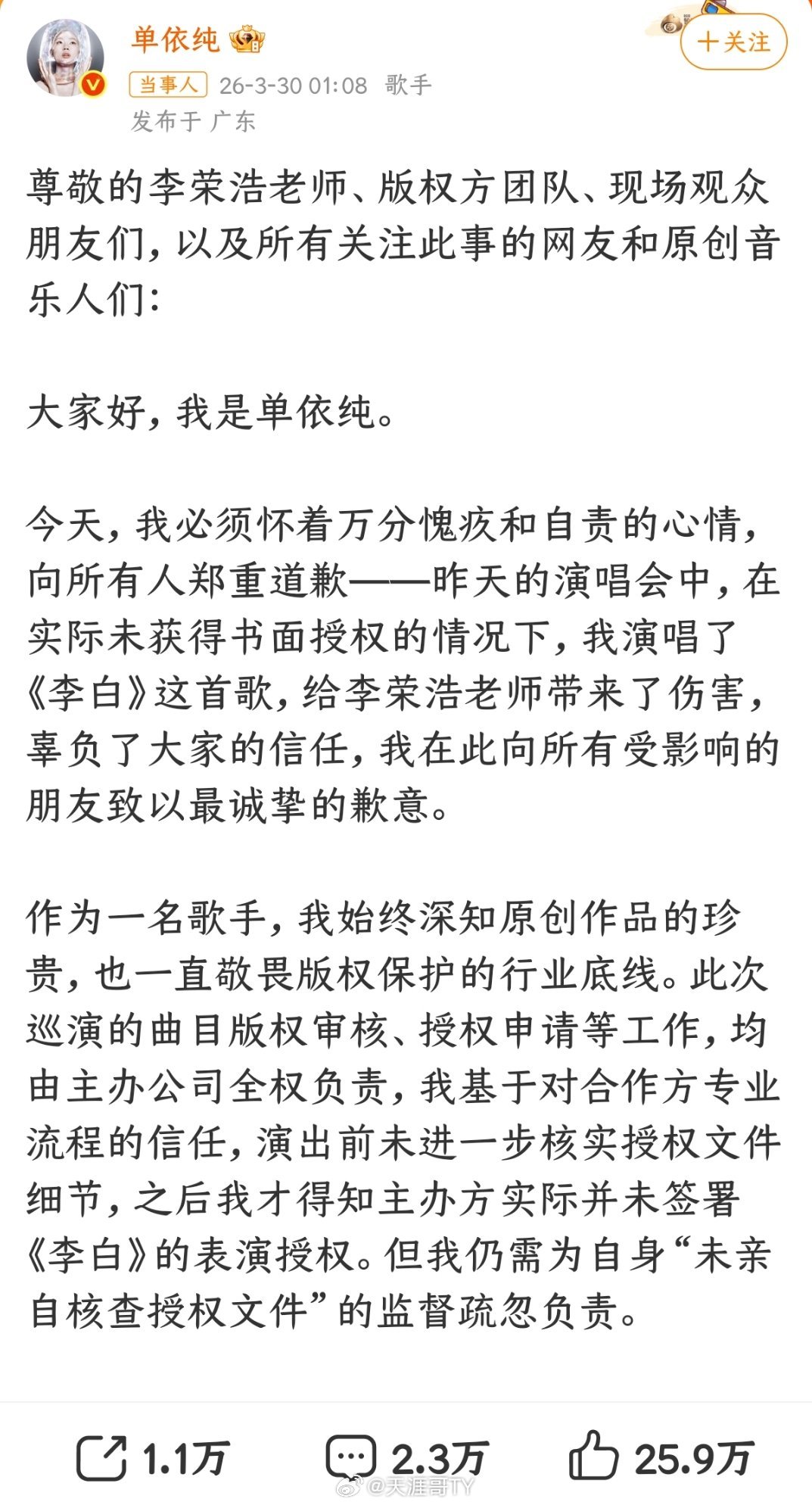 单依纯发长文回应单依纯再次发长文回应。可是总感觉回应怪怪的,比如这段:“同时我也恳请大家,理性看待和讨论这次纠纷,不参与任何形式的对立与争执,更不要对李荣浩老师及其他相关方进行指责或攻击。错误全在我,与任何人无关。”天涯哥社区