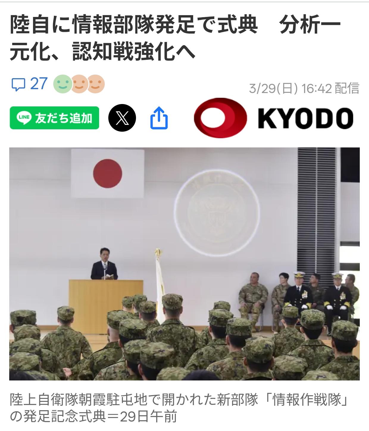 日陆自成立新“信息战部队” 3月29日,随着今年春季的组织重构,在日本陆上自卫队位于东京练马区的朝霞驻地,举行了陆上自卫队新的“信息作战部队”成立仪式。 日媒称:随着“安全环境恶化”,有必要加强应对通过“操控舆论分裂社会和政治的认知战”的能力。 由陆上自卫队各部署统一应对“认知战”的情报分析和信息收集活动。 首任队长东峰昌生陆将補从防卫副大臣宫崎政久手中接过部队旗帜。 宫崎在讲话中强调:“在日本,有大量恶意虚假信息的传播,旨在疏远日本和西方国家,破坏民众对政府和自卫队的信任,信息是展示各领域能力的基础。”