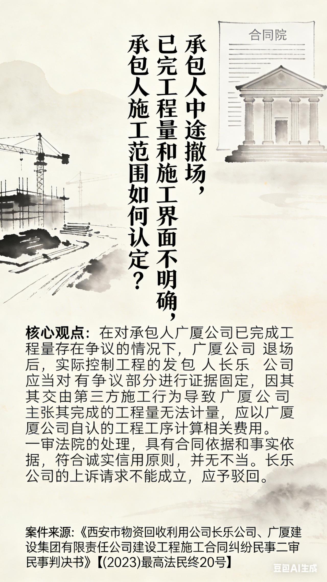 承包人中途撤场,已完工程量和施工界面不明确,承包人施工范围如何认定? 【核心观点】 在对承包人广厦公司已完成工程量存在争议的情况下,广厦公司退场后,实际控制工程的发包人长乐公司应当对有争议部分进行证据固定,因其交由第三方施工行为导致广厦公司主张其完成的工程量无法计量,应以广厦公司自认的工程工序计算相关费用。一审法院的处理,具有合同依据和事实依据,符合诚实信用原则,并无不当。长乐公司的上诉请求不能成立,应予驳回。 【案件来源】 《西安市物资回收利用公司长乐公司、广厦建设集团有限责任公司建设工程施工合同纠纷民事二审民事判决书》【(2023)最高法民终20号】
