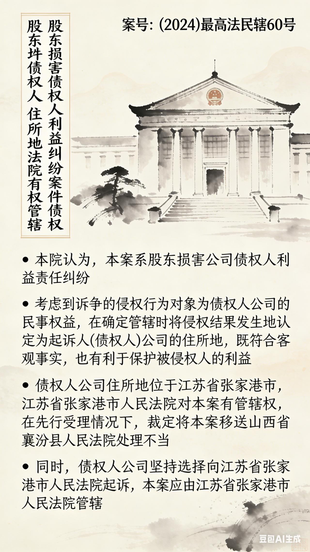 股东损害债权人利益纠纷案件债权人住所地法院有权管辖 案号:(2024)最高法民辖 60号 核心观点: 本院认为,本案系股东损害公司债权人利益责任纠纷。 考虑到诉争的侵权行为对象为债权人公司的民事权益,在确定管辖时将侵权结果发生地认定为起诉人(债权人)公司的住所地,既符合客观事实,也有利于保护被侵权人的利益。债权人公司住所地位于江苏省张家港市,江苏省张家港市人民法院对本案有管辖权,在先行受理情况下,裁定将本案移送山西省襄汾县人民法院处理不当。同时,债权人公司坚持选择向江苏省张家港市人民法院起诉,本案应由江苏省张家港市人民法院管辖。