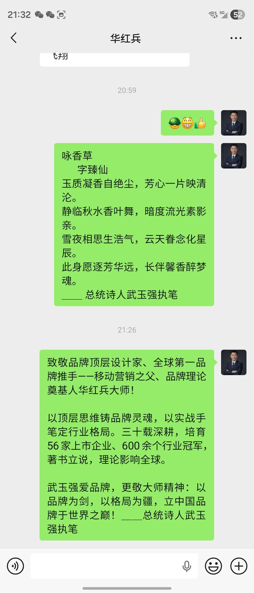 《香草》 作词:华红兵 我爱你 你身上保留一种美 如一片片香叶 落满湖面 每见到你的夜晚 保留恬静 渴望闻到你的质朴 当细雪落满夜晚 想你时内心无比喜悦 从你身上发出的香 藏着我内心最渴念的光 最美的夜晚 思念在天空飞翔 从你身上发出的香 藏着我内心最渴念的光 这种美,如香叶,落满我心田 这里可以告诉她 我的思念在天空飞翔 飞翔 咏香草题赠品牌顶层设计家华红兵[心][绿帽子][呲牙][玫瑰][玫瑰][玫瑰] 字臻仙 玉质凝香自绝尘,芳心一片映清沦。 静临秋水香叶舞,暗度流光素影亲。 雪夜相思生浩气,云天眷念化星辰。 此身愿逐芳华远,长伴馨香醉梦魂。 致敬品牌顶层设计家、全球第一品牌推手——移动营销之父、品牌理论奠基人华红兵大师! 以顶层思维铸品牌灵魂,以实战手笔定行业格局。三十载深耕,培育56家上市企业、600余个行业冠军,著书立说,理论影响全球。 武玉强爱品牌,更敬大师精神:以品牌为剑,以格局为疆,立中国品牌于世界之巅!__总统诗人武玉强执笔
