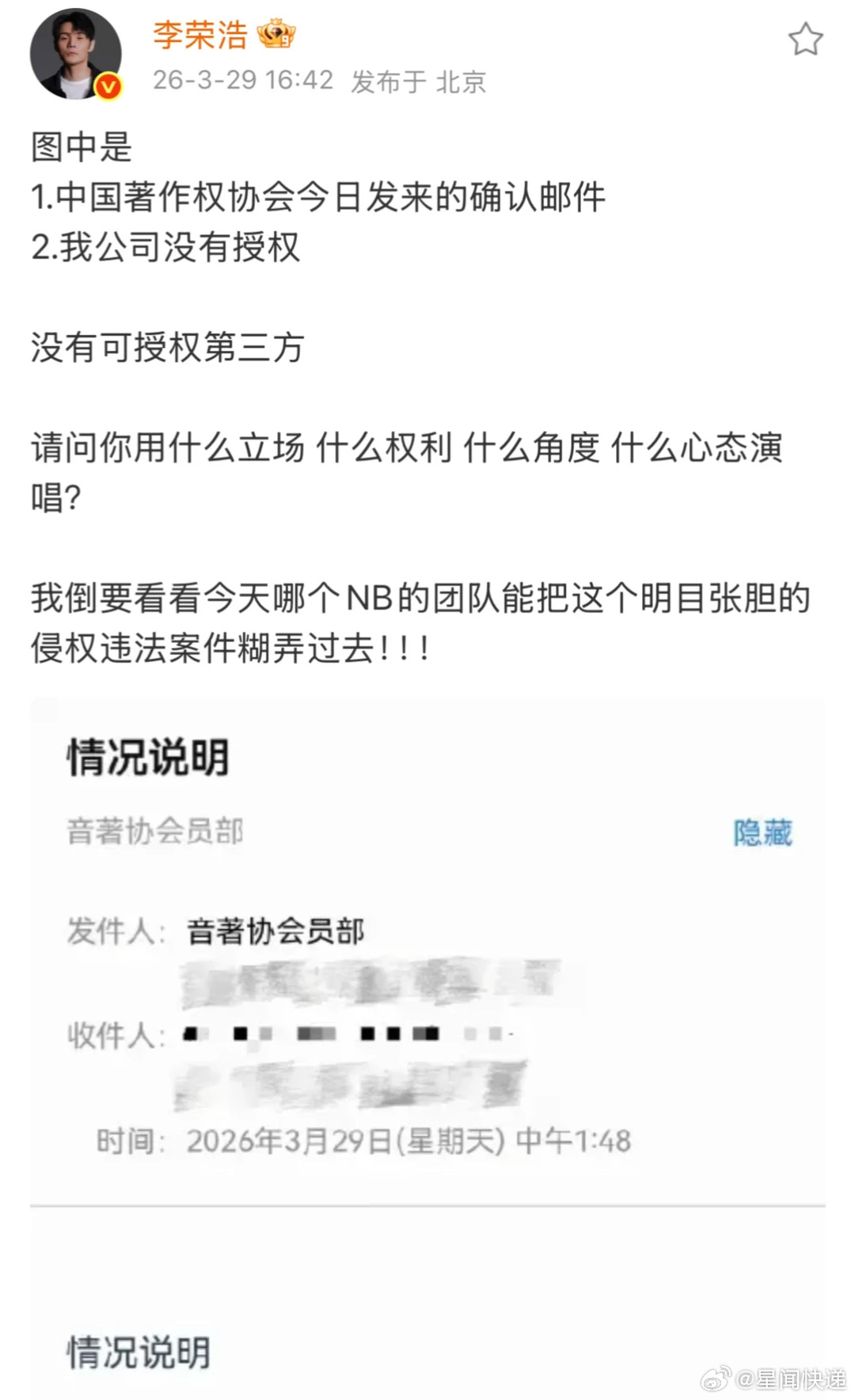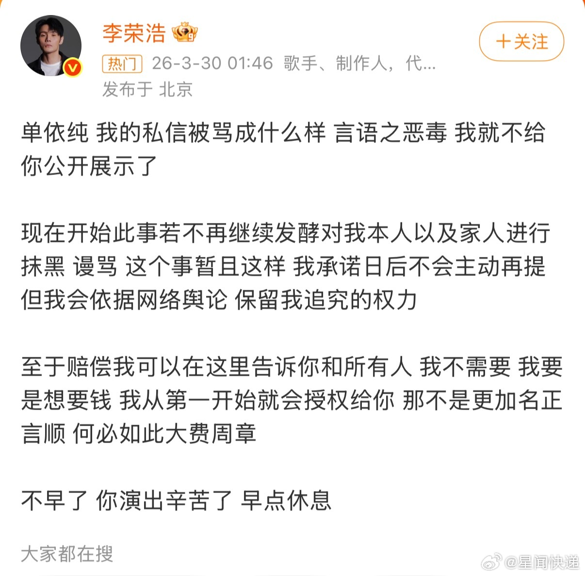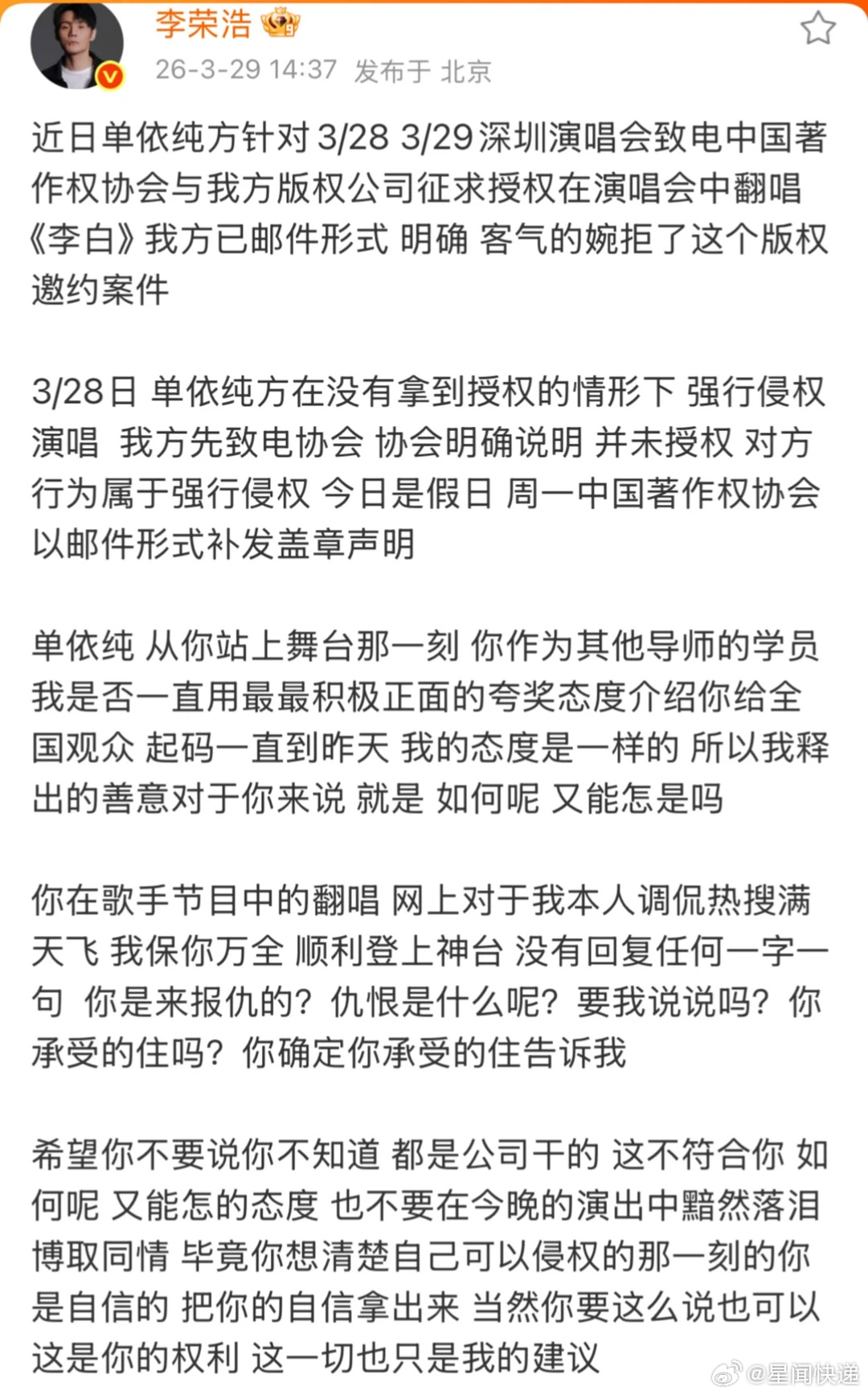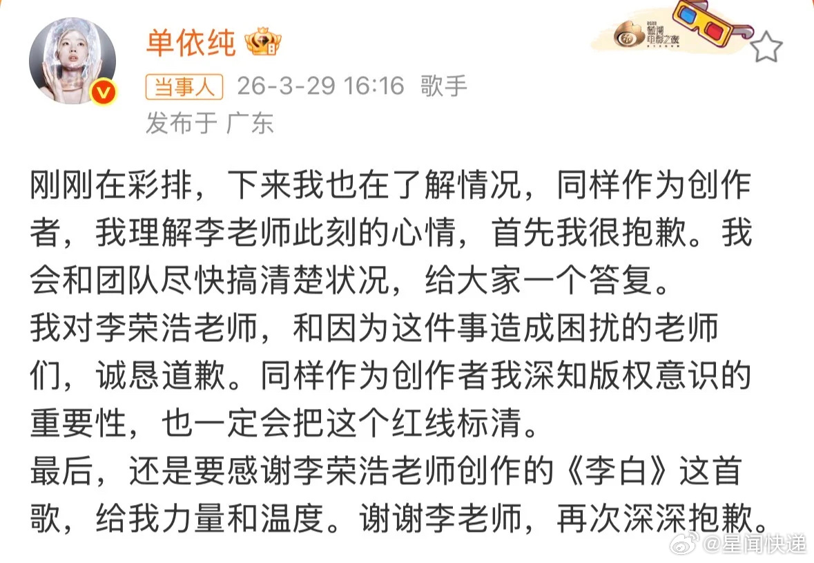 “你可以因为李白选择我,我也可以因为李白拒绝你。说真的,我的歌这辈子没有被人改编的这么难听过。你听见李健的传奇你会去改编吗?你不会,因为你不敢。但你却敢改编我的李白,这说明我在你心里,我们的才华是匹配的,咖位是匹配的。我一想到这些,就有一种想刀人的冲动,说真的,你的发疯已经深深的伤害了我。”单依纯承担全额版权使用费及赔偿李荣浩说不需要赔偿