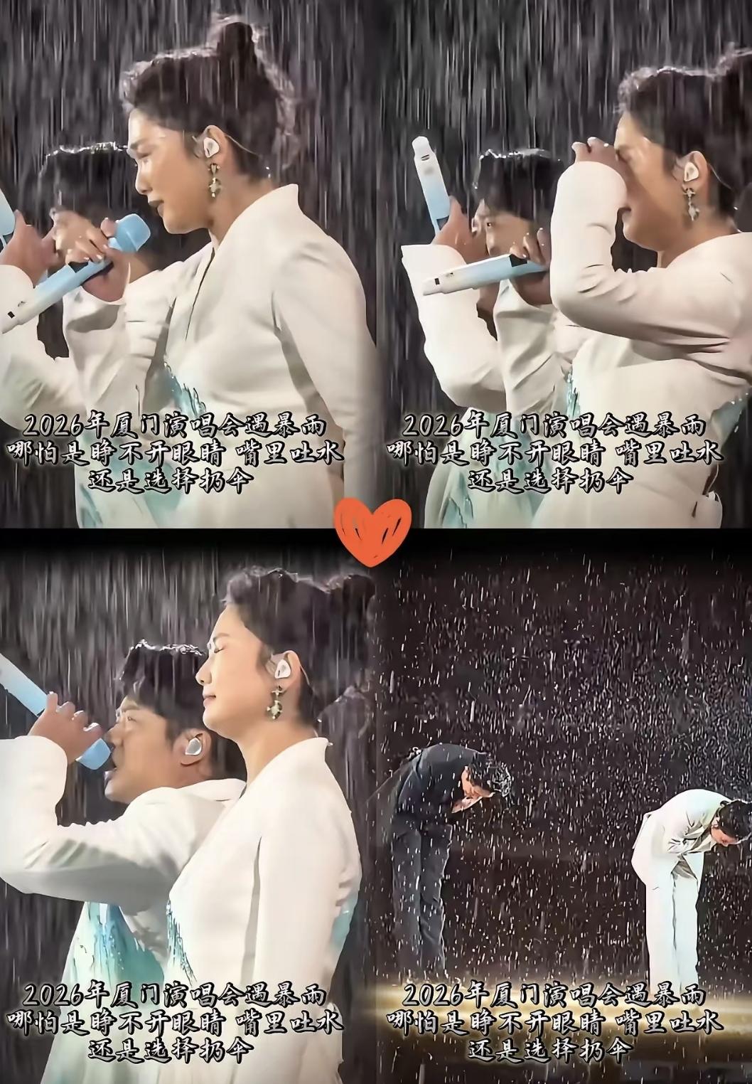 暴雨突袭厦门演唱会,凤凰传奇扔伞开唱,万人跟着淋成落汤鸡。 3月28号那晚,白鹭体育场雨大得像天上破了个洞,灯一打,水雾全飘在半空。玲花睁不开眼还硬吼《山河图》,曾毅扯着嗓子改词:“就让雨全往下砸!”没人跑,连老头老太太都举着荧光棒蹦。 雨水顺着头发流进领子,歌迷笑说“票根湿透了,字比人还清楚”。保洁第二天扫出几百个空水瓶——昨儿大家倒光水,当鼓敲。 呼和浩特漏雨座位变“澡票”,郑州内场淋成“豫淋军”,南昌1380块的票真泡在水里两小时……不是他们不怕雨,是早习惯跟凤凰传奇一起“扛着唱”。 别的演出怕停电、怕冒雨、怕差评,他们怕的只有一样:观众没唱尽兴。 雨停了,跑道上全是水,霓虹一照,像洒了一地碎玻璃。
