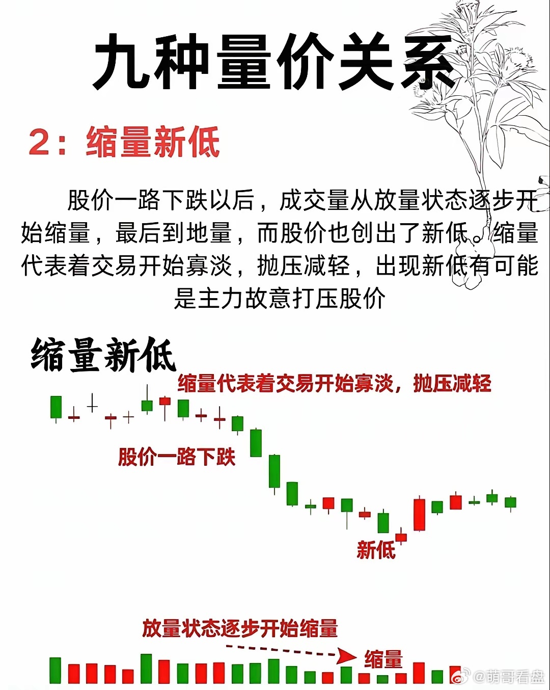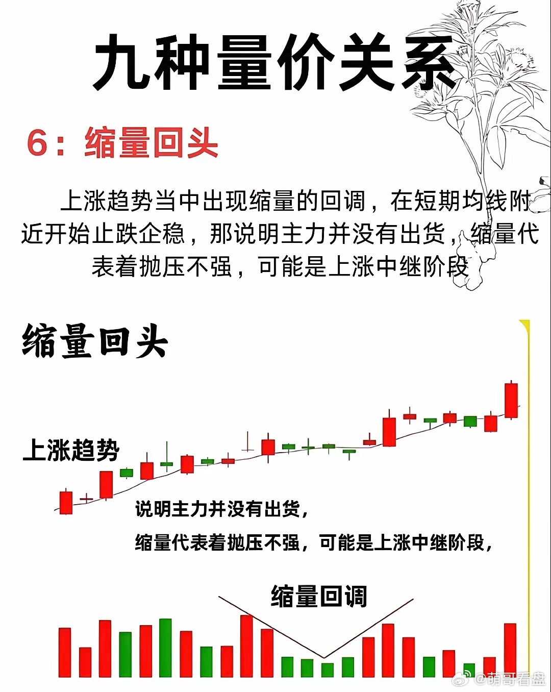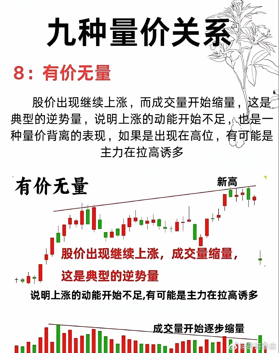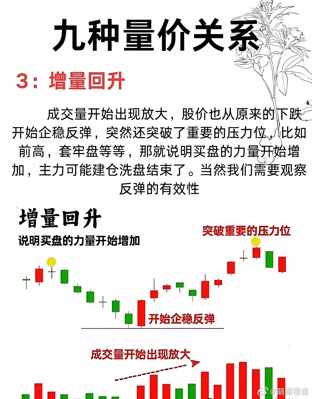 炒股小白想入门,弄懂量价关系很重要,这可是判断市场的晴雨表。我给大家说说9种常见的量价关系。比如量增价涨,这是市场向好的信号,成交量增加,股价上涨,说明买盘强劲。还有量增价平,成交量放大但股价没怎么动,可能主力在吸筹。量缩价涨,成交量减少股价却涨,这种情况可能上涨动力不足。量缩价跌,成交量少股价下跌,可能跌势还会持续。量增价跌,成交量大股价却跌,要小心主力出货。另外还有量平价涨、量平价跌、量缩价平、量增价平转涨等情况。掌握这些,炒股能少走很多弯路。