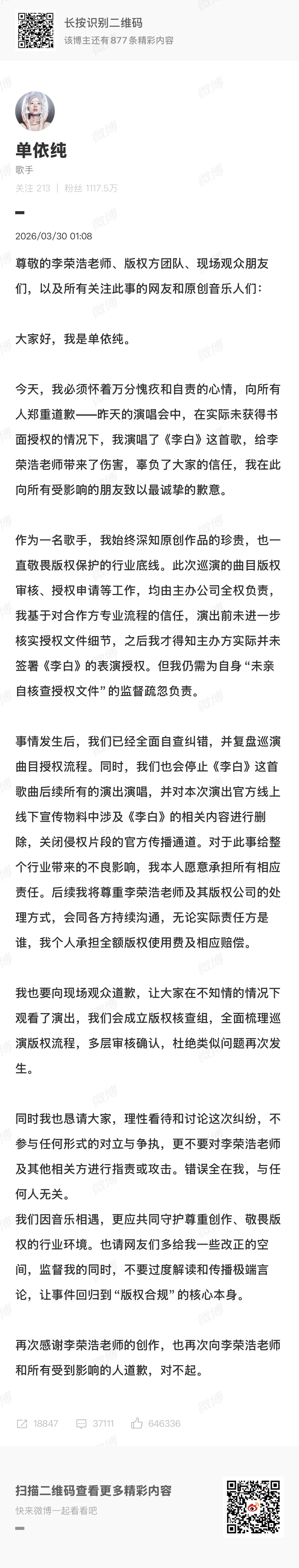 单依纯发长文回应李荣浩 单依纯强行侵权 凌晨发长文道歉,她称此次巡演的曲目版权审核、授权申请等工作,均由主办公司全权负责,自己演出前未进一步核实授权文件细节,之后才得知主办方实际并未签署《李白》的表演授权。“但我仍需为自身‘未亲自核查授权文件’的监督疏忽负责。”随后,李荣浩也回应称此事若不再发酵,将会就此作罢,他的目的并不是需要赔偿等。至此,这件事暂告一段落。