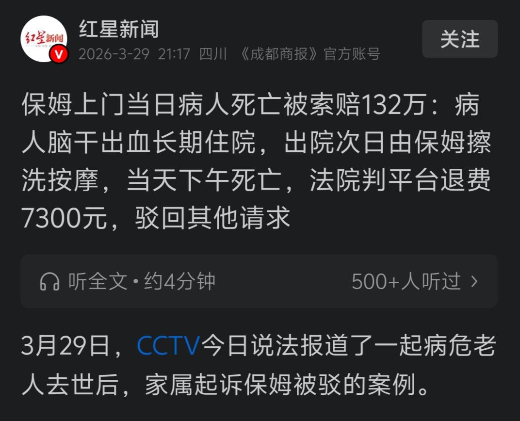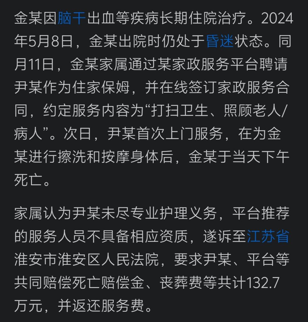 江苏淮安,老人深度昏迷请保姆当天去世后,家属索赔132.7万。法院替保姆申冤的同