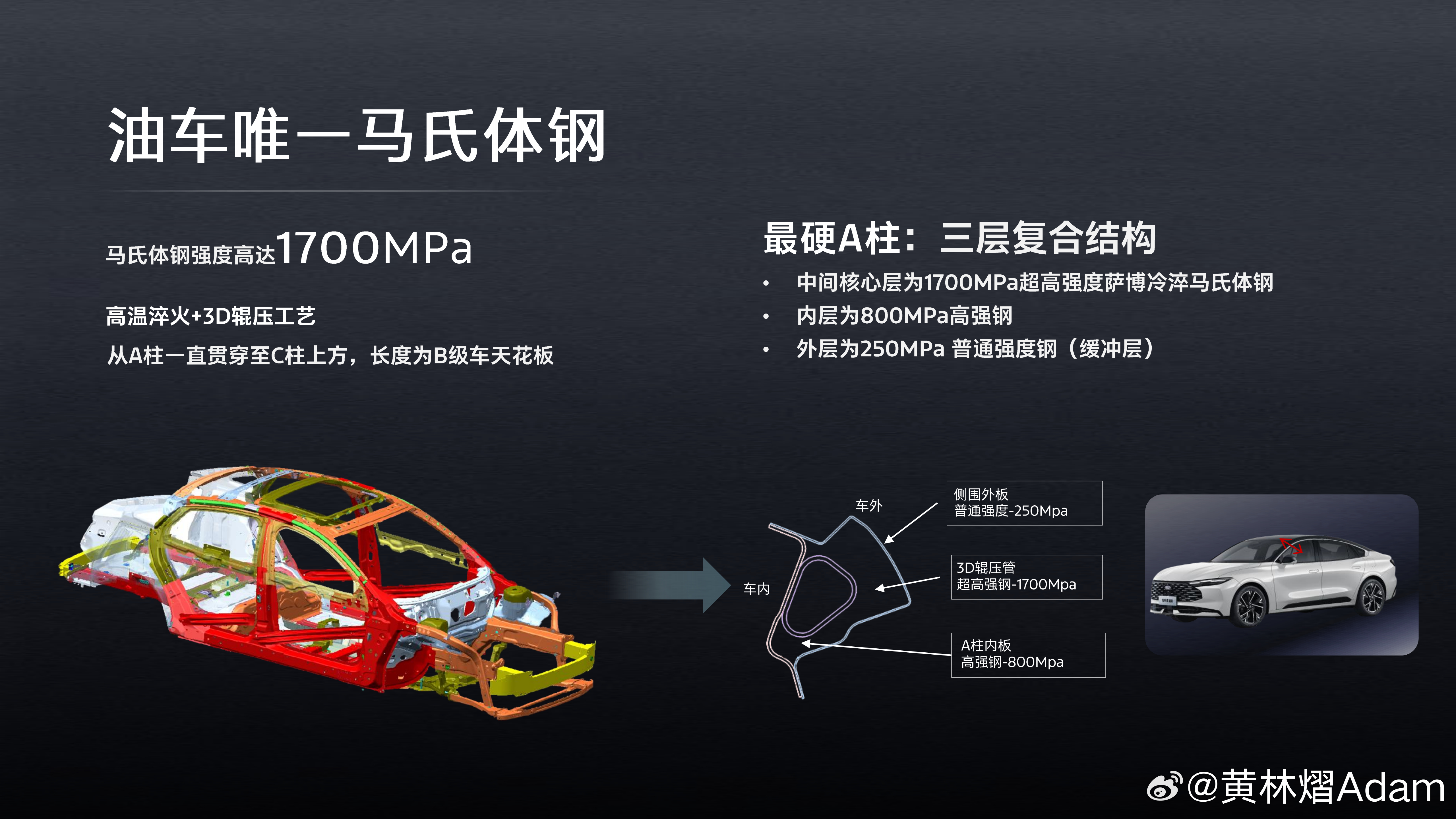 3.全车大量使用高强度钢,在A柱上额外加强结构和使用了1700Mpa的马氏体钢,就连车门里都加了加强筋,单论车身强度和安全系数在同级是一个对手都没有。