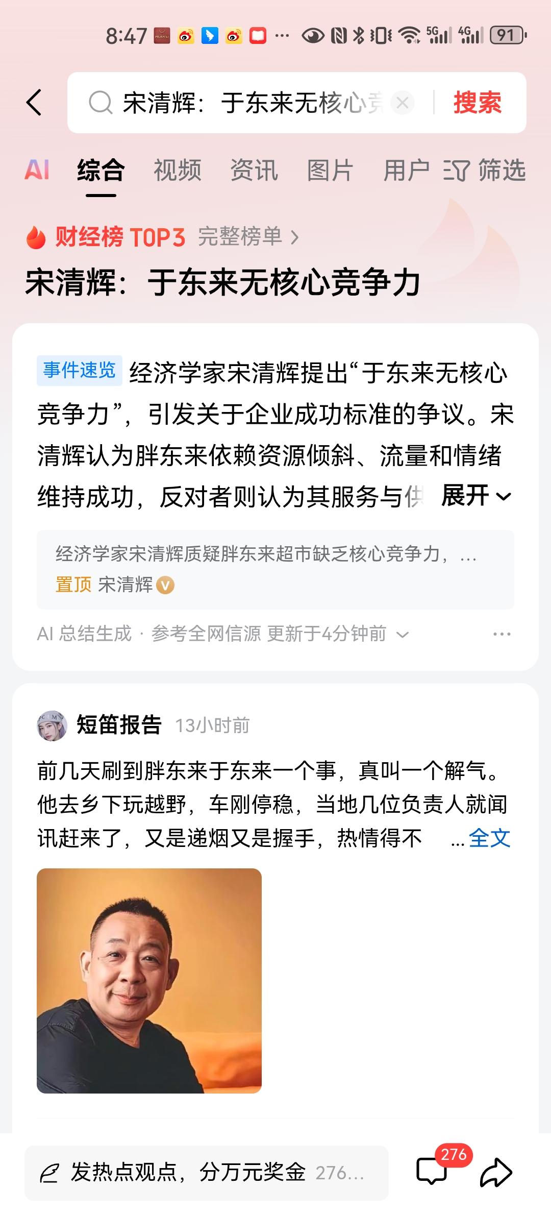 那么看一看“经济学者”宋清辉先生有没有核心竞争力?他进入的是两个行业,分别来论述。在自媒体行业中,他的粉丝不多,影响力不够,同样他也没有得到这一行业最宝贵的资源,那就是流量。有可能他的主页数据就是最好的说服力。那么另外他进入的是经济评论行业,这一行业需要令人信服的背景和专业能力,但是宋先生过去的学习经历不够,行业的专业背景度被人认可的不够,可能也没啥核心竞争力。 所以说,于东来可能有着核心竞争力,而宋先生则没有。