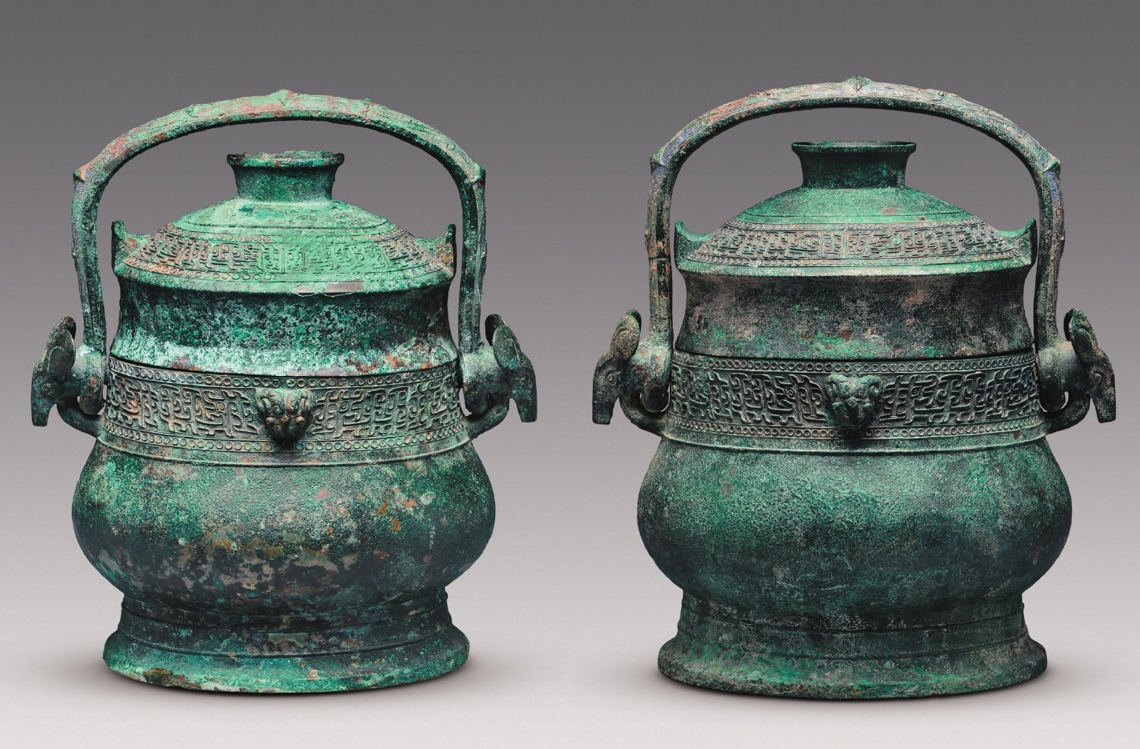 每天一件青铜器 中贸圣佳香港2026春拍上拍西周早期:"西作父丁寶尊彝". 这种以细阳线勾勒龙纹装饰的器物是非常少见的. 与这件最相似的应该是山西翼城大河口西周霸国墓葬M1霸伯墓出土的一对卣(图2), 两组器物形制和纹饰都非常接近, 只是提梁兽首造型不同. 这件上拍的卣有部分修复, 比如提梁连接处等