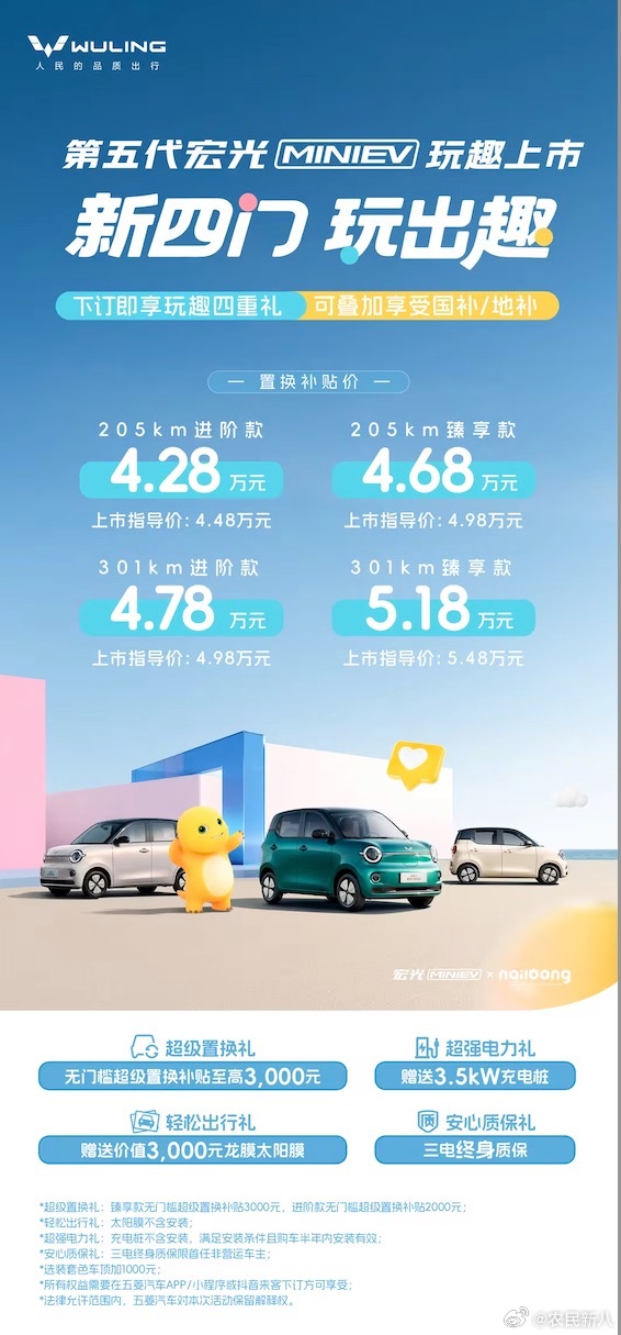 第五代五菱宏光miniev价格来了!提供四款配置车型置换补贴价4.28-5.18万元全新外观+车机升级,这个价格大家会考虑吗?第五代宏光miniev
