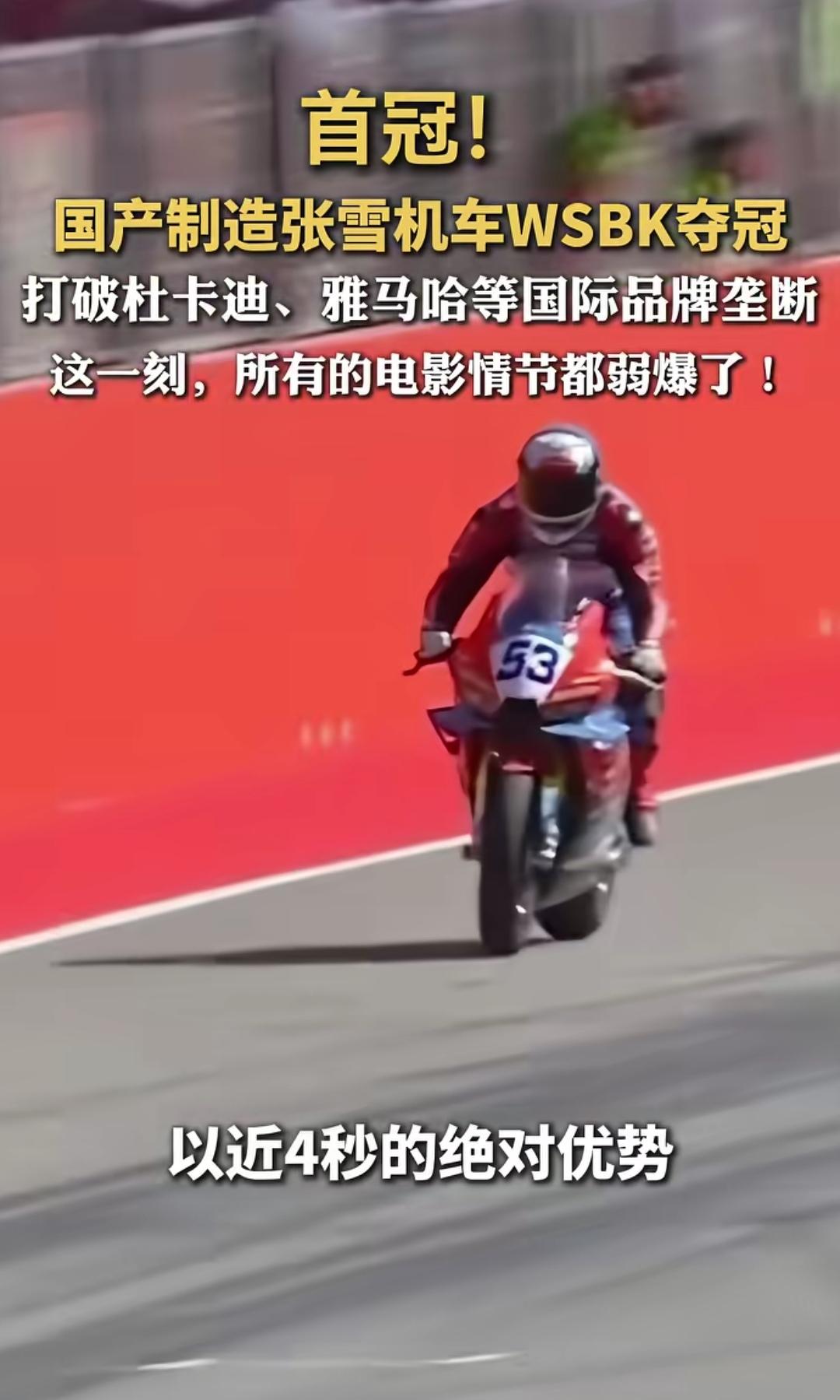 创历史!张雪机车WSBK葡萄牙站双冠,国产摩托登顶世界顶级赛场 北京时间3月28-29日,世界超级摩托车锦标赛(WSBK)葡萄牙站,中国品牌张雪机车创造历史 。 车手瓦伦丁·德比斯驾驶53号ZXMOTO 820RR-RS赛车: 首回合:第2位发车,全程领跑,以3.685秒优势夺冠。 次回合:开局失误跌至第3,强势反超再夺一冠。 这是中国摩托制造商在WSBK的首冠,打破杜卡迪、雅马哈等欧美日品牌数十年垄断 。