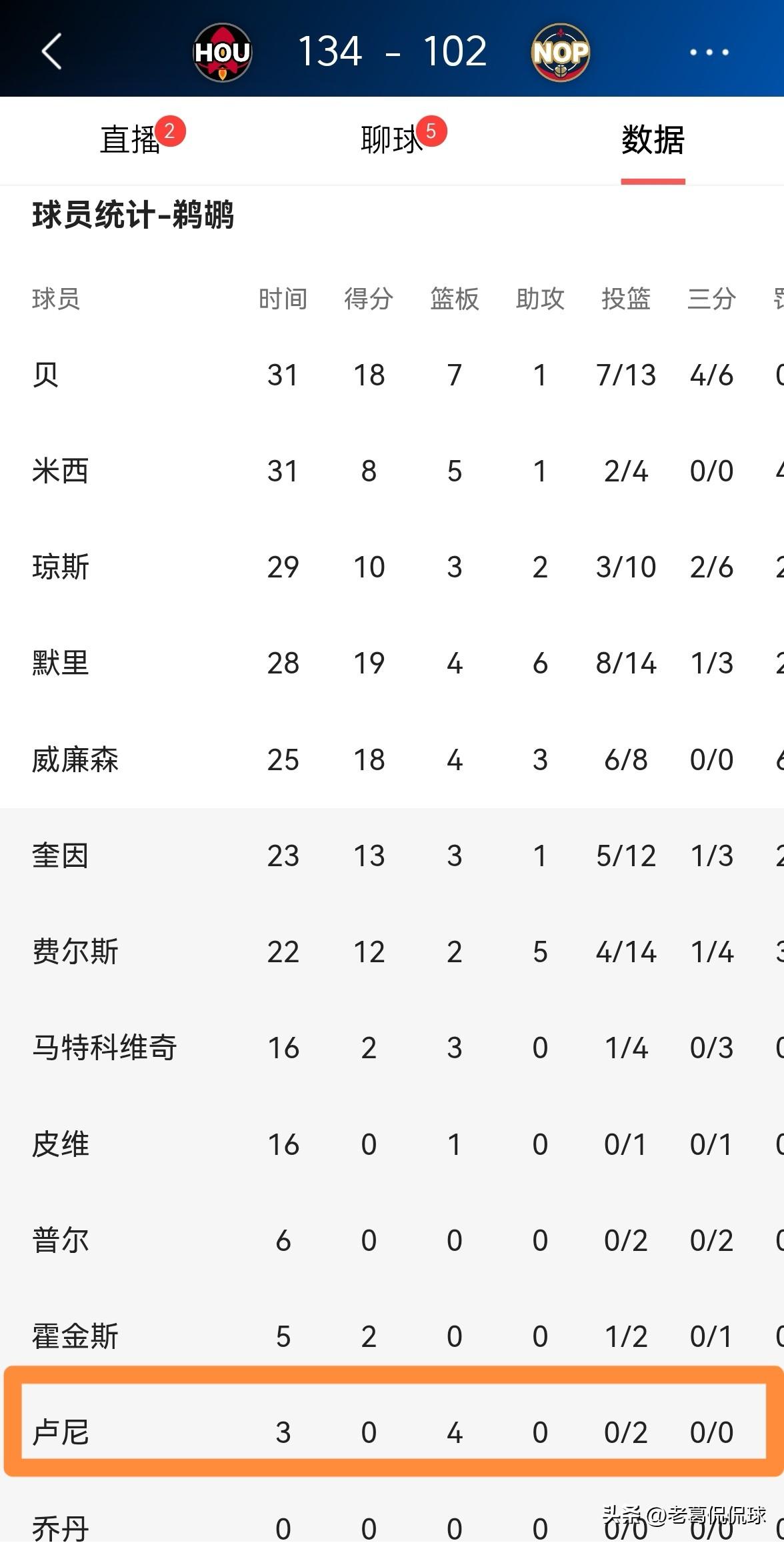 鹈鹕老将卢尼真是彻底的凉凉了!在今天鹈鹕主场以102:134惨败于火箭的比赛中,卢尼替补出战3分钟,投篮2中0怒砍0分,不过有4篮板,他的场上正负值为-5。 毫不客气的说,卢尼在鹈鹕已经彻底的凉凉了,卢尼完全不在球队的计划里。如果卢尼想要挽救自己的职业生涯,他必须转投一支更适合自己的球队,或者重返老东家勇士。