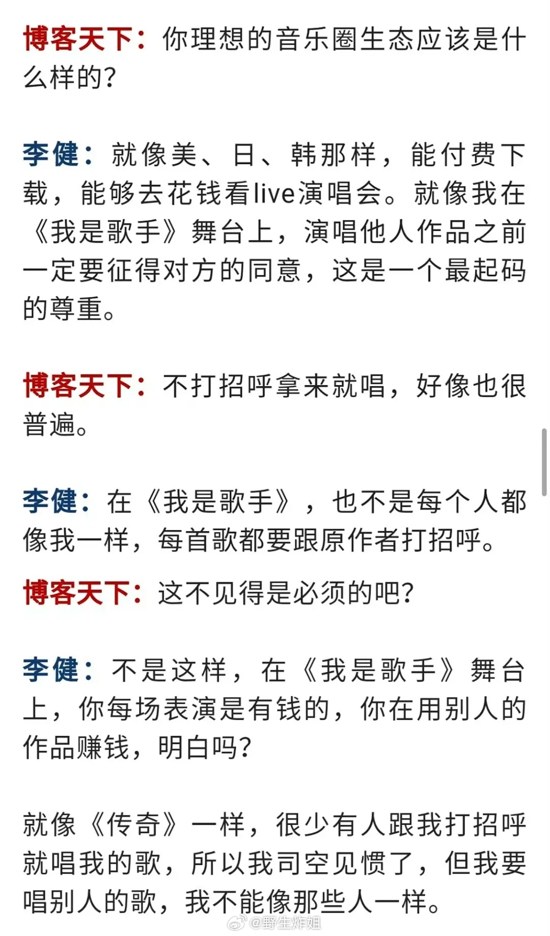 十年前,版权还没有被这几年这样被重视,音综节目组甚至都不会妥善解决版权,但李健上《我是歌手》每一首翻唱都会亲自(指不是让团队去)联系作者,征得同意并交流